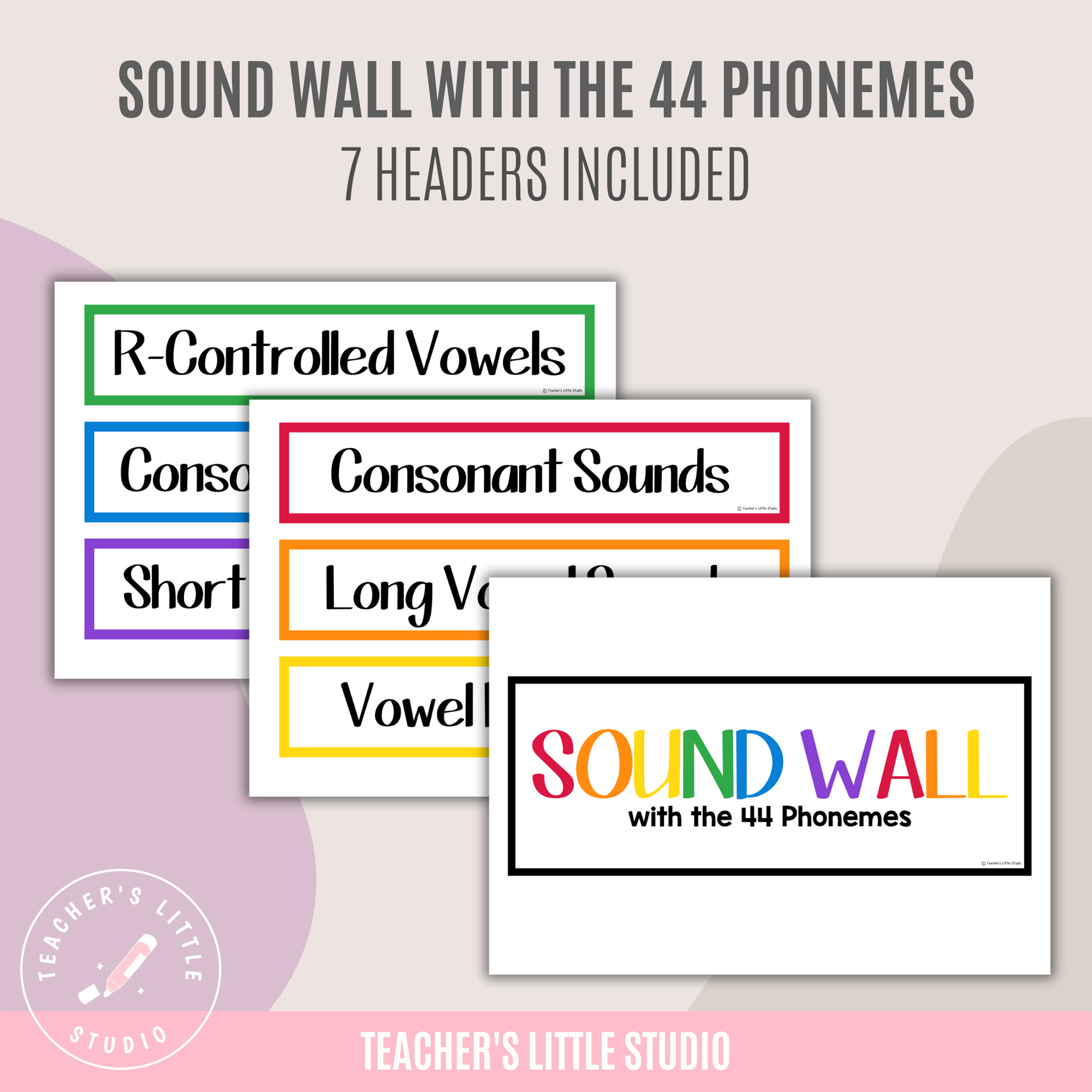 7 headers: Sound Wall with the 44 Sounds, Consonant Sounds, Short Vowel Sounds, Long Vowel Sounds, Consonant Digraphs, R-Controlled Vowels, Vowel Diphthongs (3 pages)