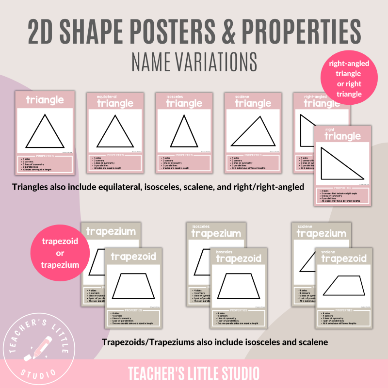 With variations for different naming conventions (trapezium/trapezoid, right-angled/right triangle, sides on circles/ovals), these posters ensure flexibility for a range of learners.