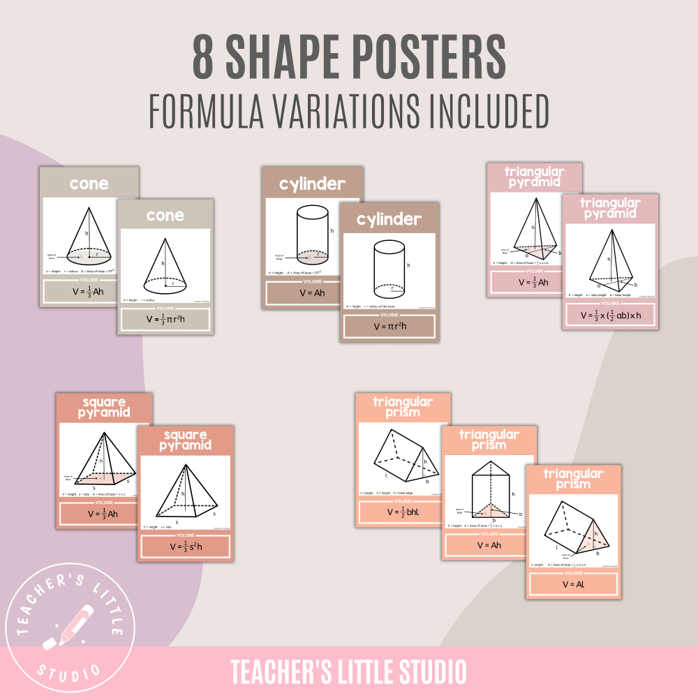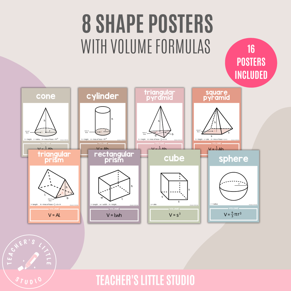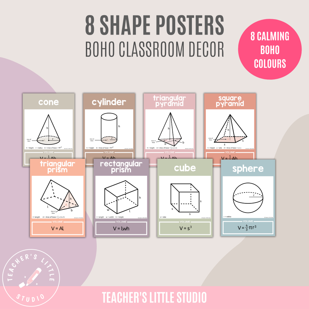 Boho 3D Shapes with Volume Formulas for primary, elementary, and middle school. Includes 16 printable posters with formulas, variations, and a definition poster.
