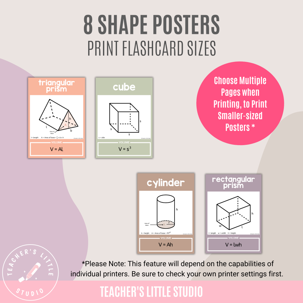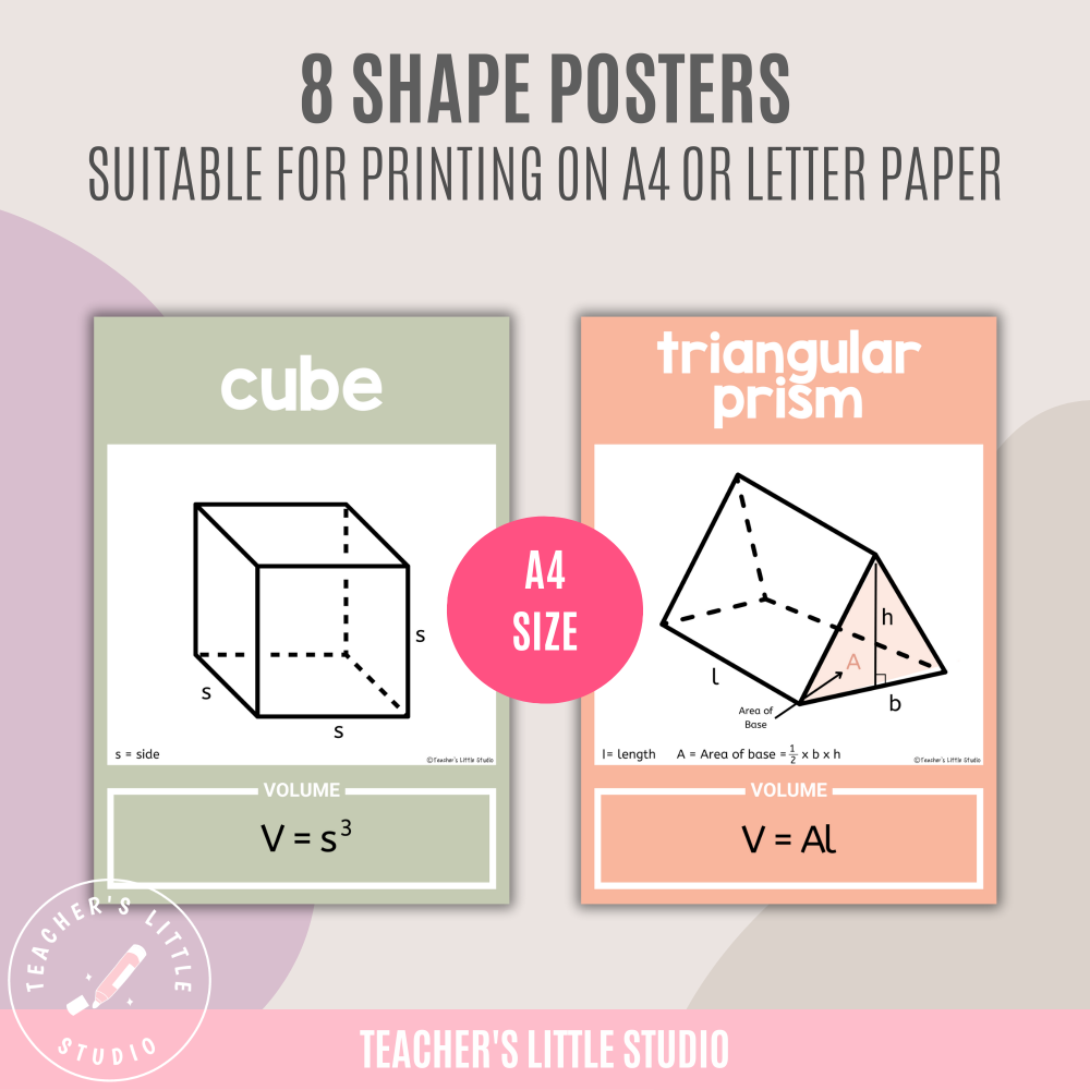 Posters are sized at A4 but can also be printed on US Letter paper or reduced to create flashcards for small-group practice (though this will depend on your printer settings). Laminating is recommended for long-term classroom use. These posters are perfect for classroom displays, teaching aids, and reference tools to help students master 3D volume concepts.