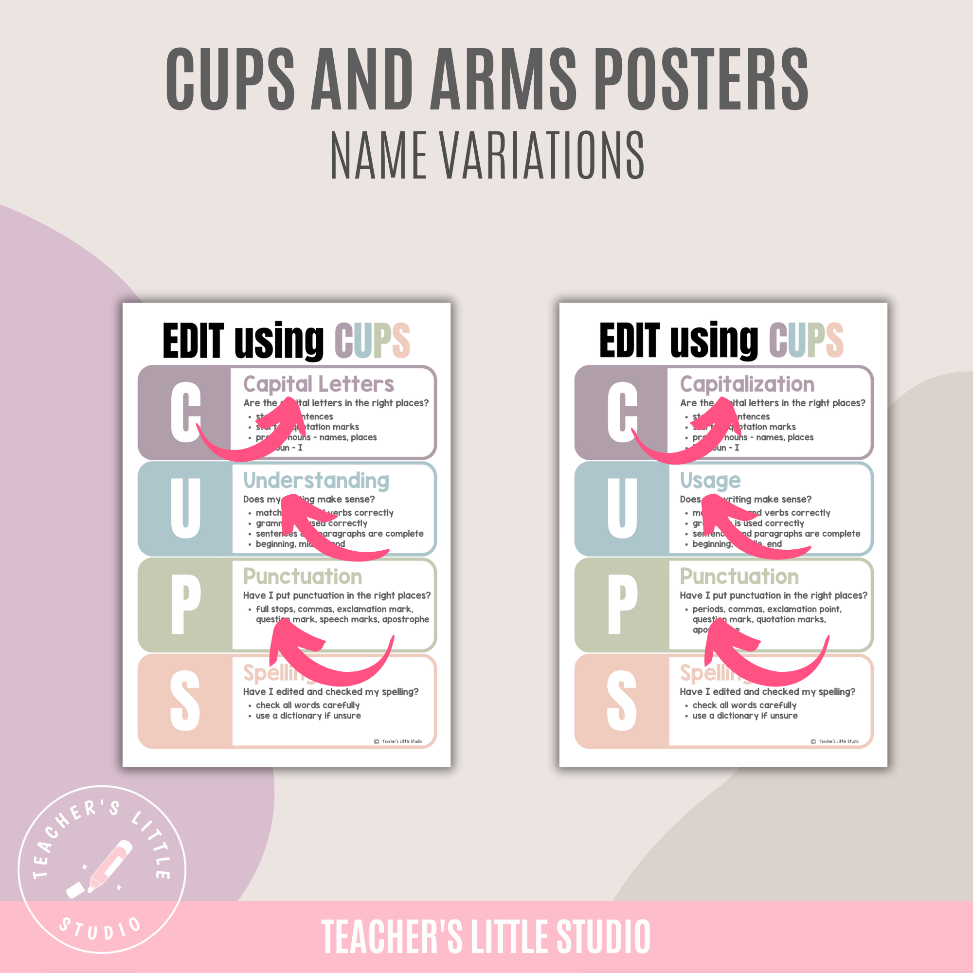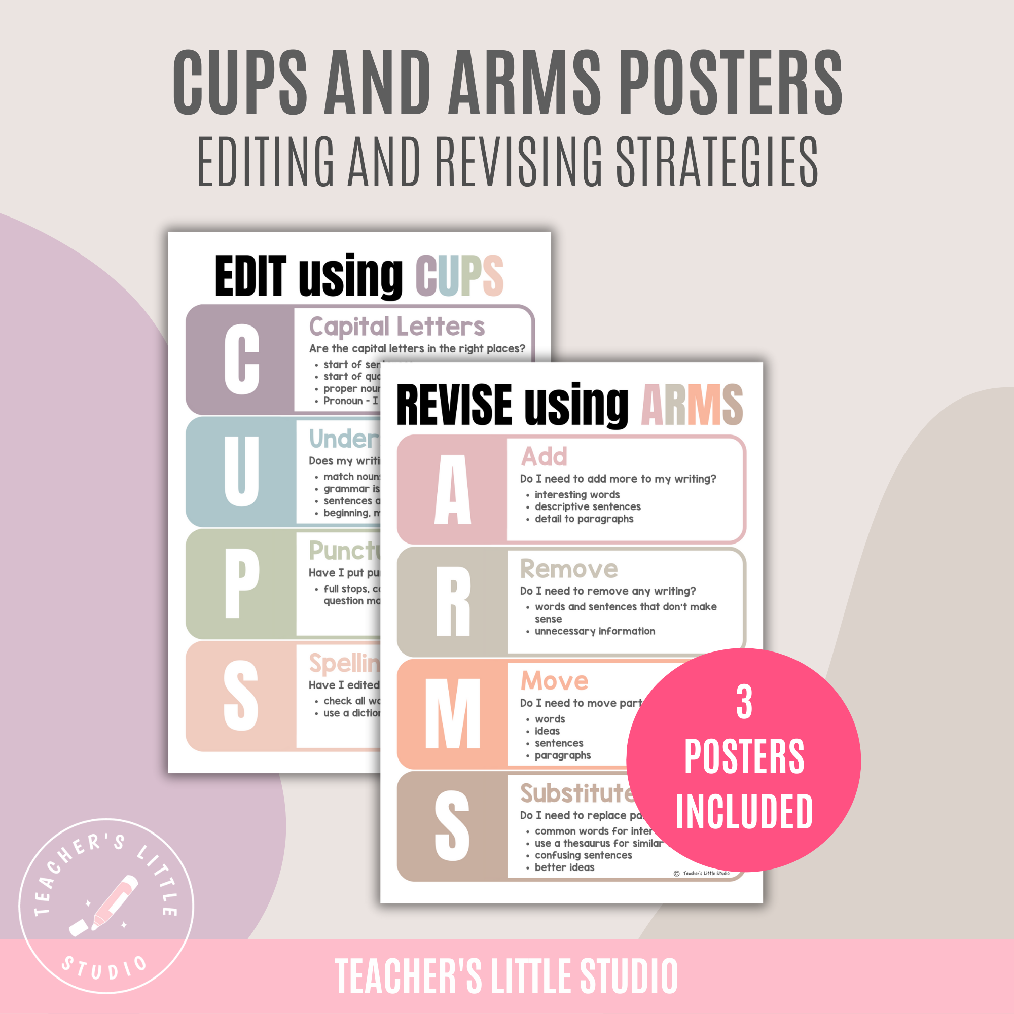 Make the writing process easier for your students with these CUPS and ARMS Writing Strategy Posters. Perfect for primary and elementary classrooms, these posters are a valuable English resource to guide students through editing and revising their work.