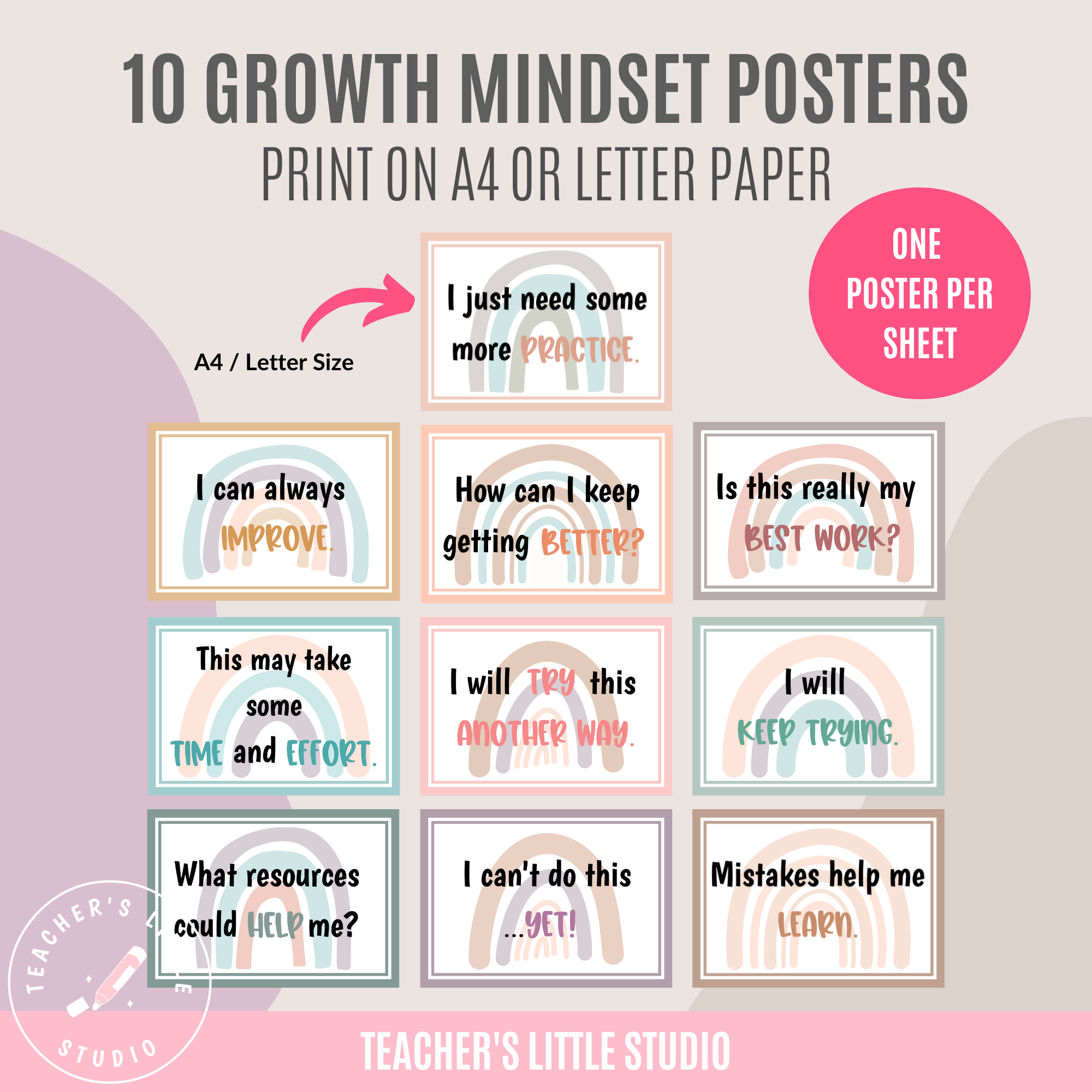 This set includes 10 posters, each featuring a unique boho-colored rainbow and a motivational Growth Mindset saying. To encourage reflection, every poster also includes a smaller Fixed Mindset saying for contrast.