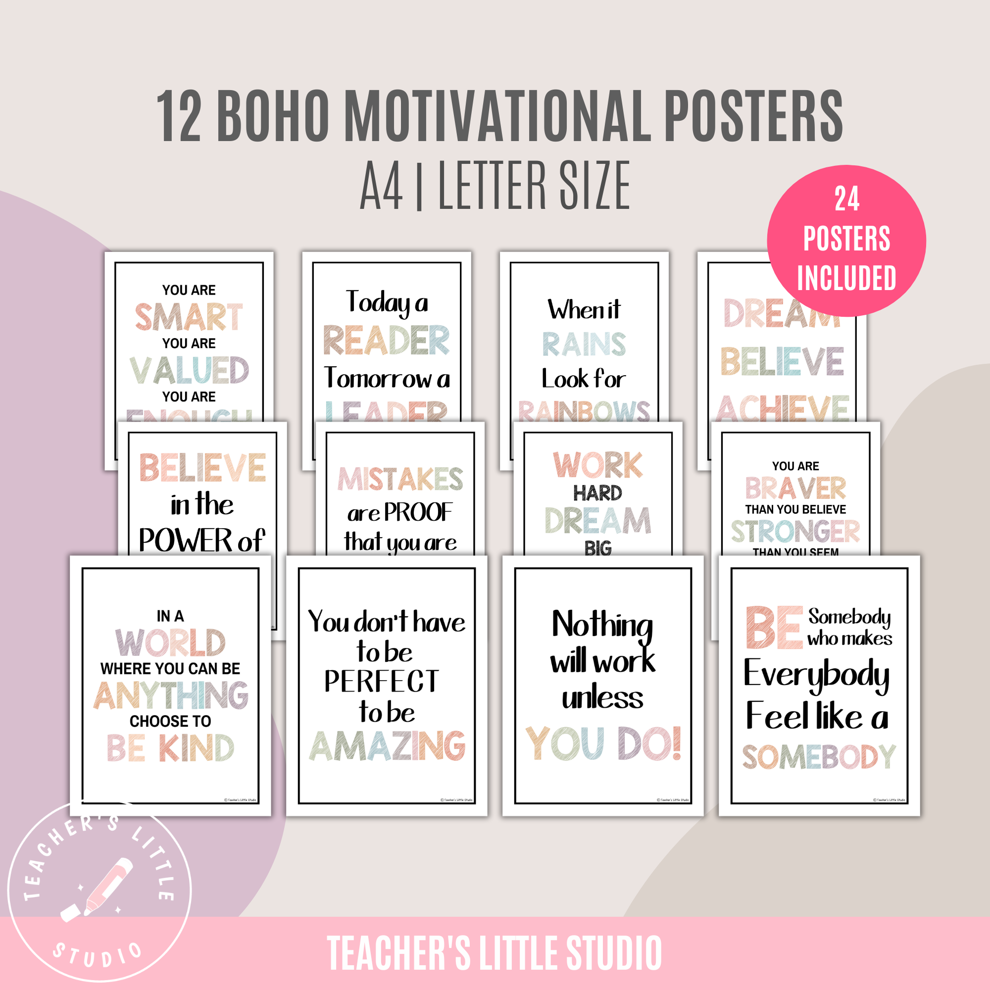These ready-to-print inspirational quotes come in a boho-earthy palette, ideal for calm classroom settings. Two sizes are included – A4 and Letter size. It is recommended that you laminate these positive motivational posters for long-term use.