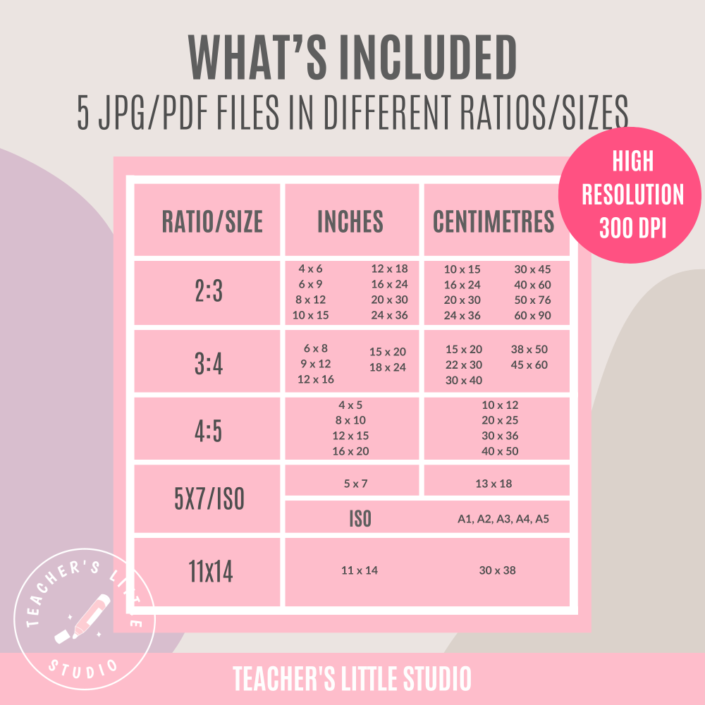 The chart comes in high-resolution 300dpi, available in both PDF and JPG formats across five aspect ratios (2:3, 3:4, 4:5, 5×7/ISO, and 11×14) for flexible printing options. Simply download, print your preferred size, and laminate or frame it for long-term use.