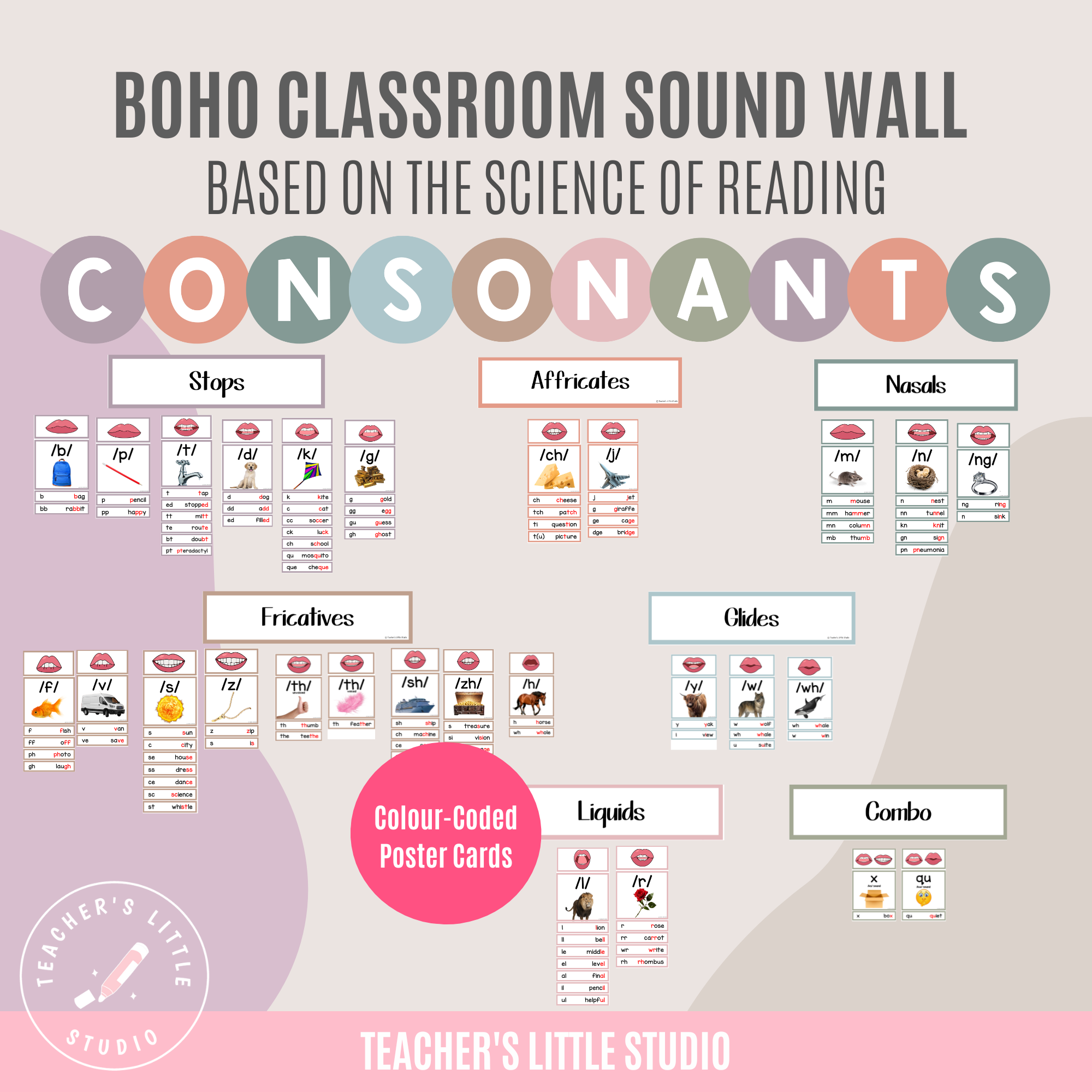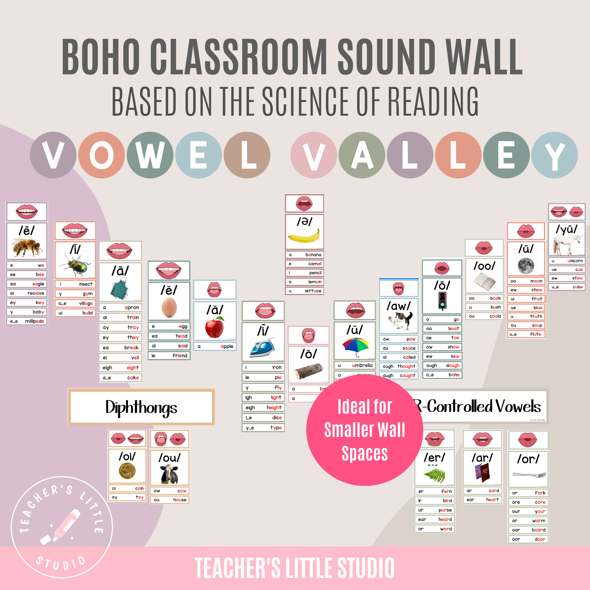 Boho Phonics Sound Wall posters based on the Science of Reading. Includes Vowel Valley and Consonant cards with mouth articulation images to support phonics, spelling, and ESL learners.