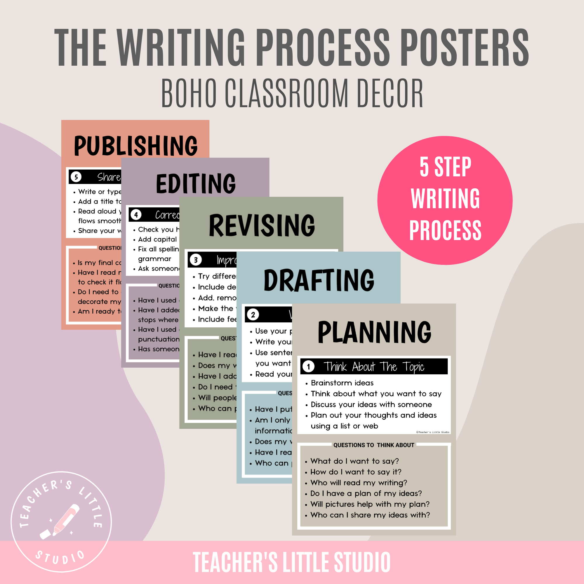 Make the writing process simple and engaging for primary and elementary students with these Boho Writing Process Posters. Designed as a classroom teaching aid, these posters clearly explain each step of writing, helping students plan, draft, revise, edit, and publish their work.