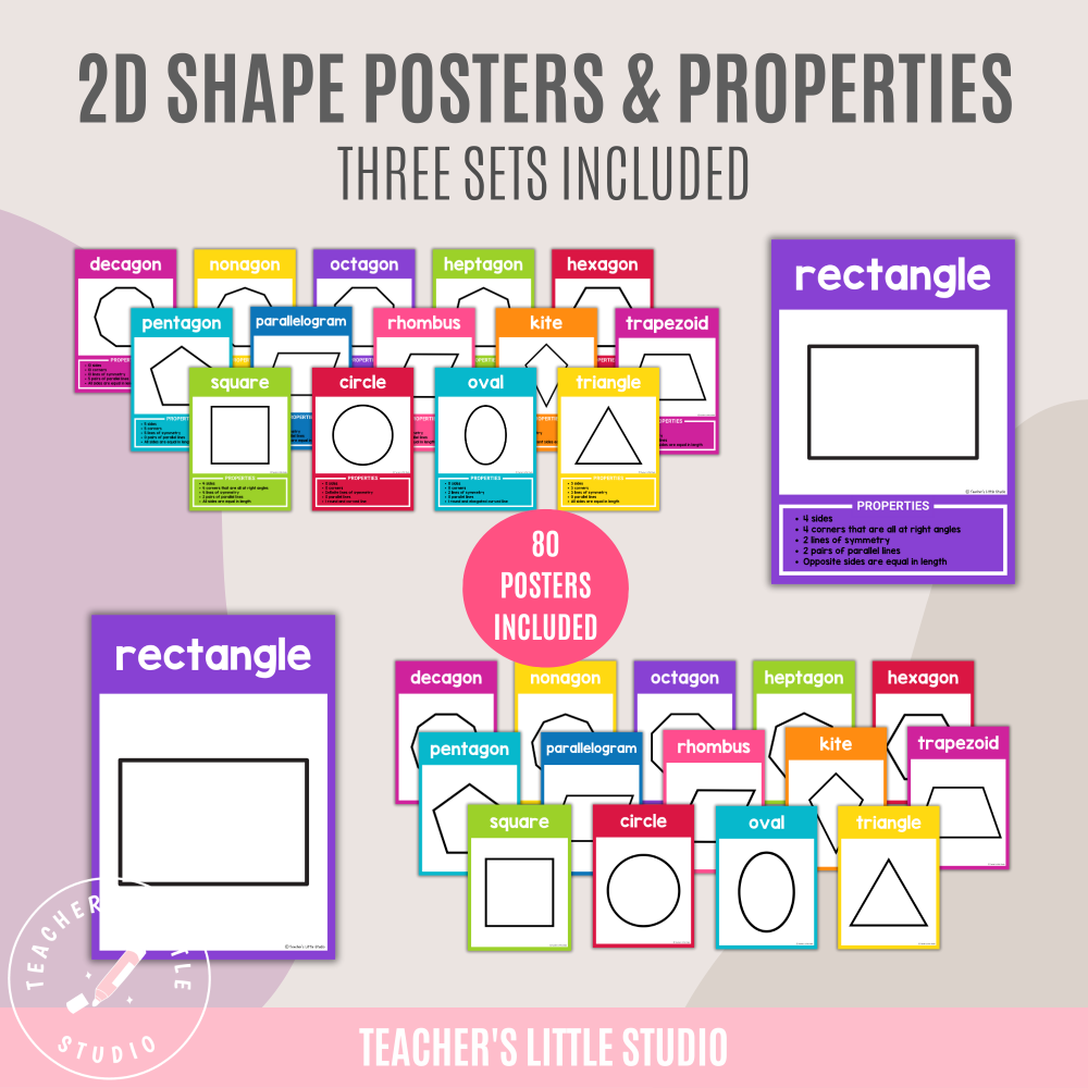 These Bright 2D Shapes with Properties Posters are perfect for teaching geometry in primary, elementary, and homeschool classrooms. Each set includes posters with properties, attributes, and name-only versions to help students confidently identify and describe 2D shapes.