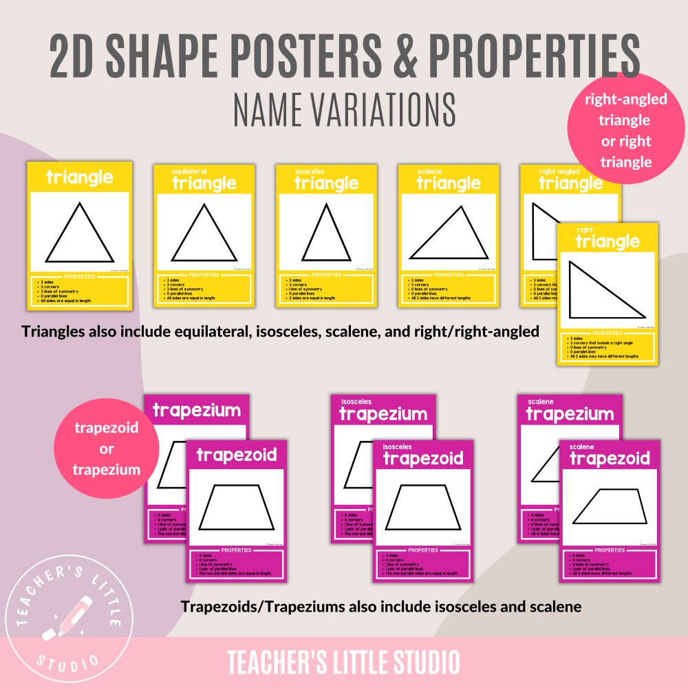 With variations for different naming conventions (trapezium/trapezoid, right-angled/right triangle, sides on circles/ovals), these posters ensure flexibility for a range of learners.