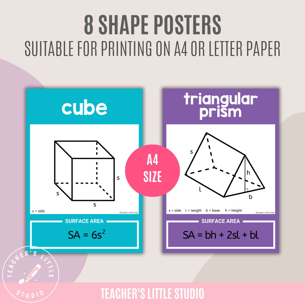 Enhance your math classroom or homeschooling space with these Bright 3D Shapes with Surface Area Formulas. Perfect for primary, elementary, and middle school students, these posters provide clear formulas and definitions for calculating the surface area of 3D shapes.
