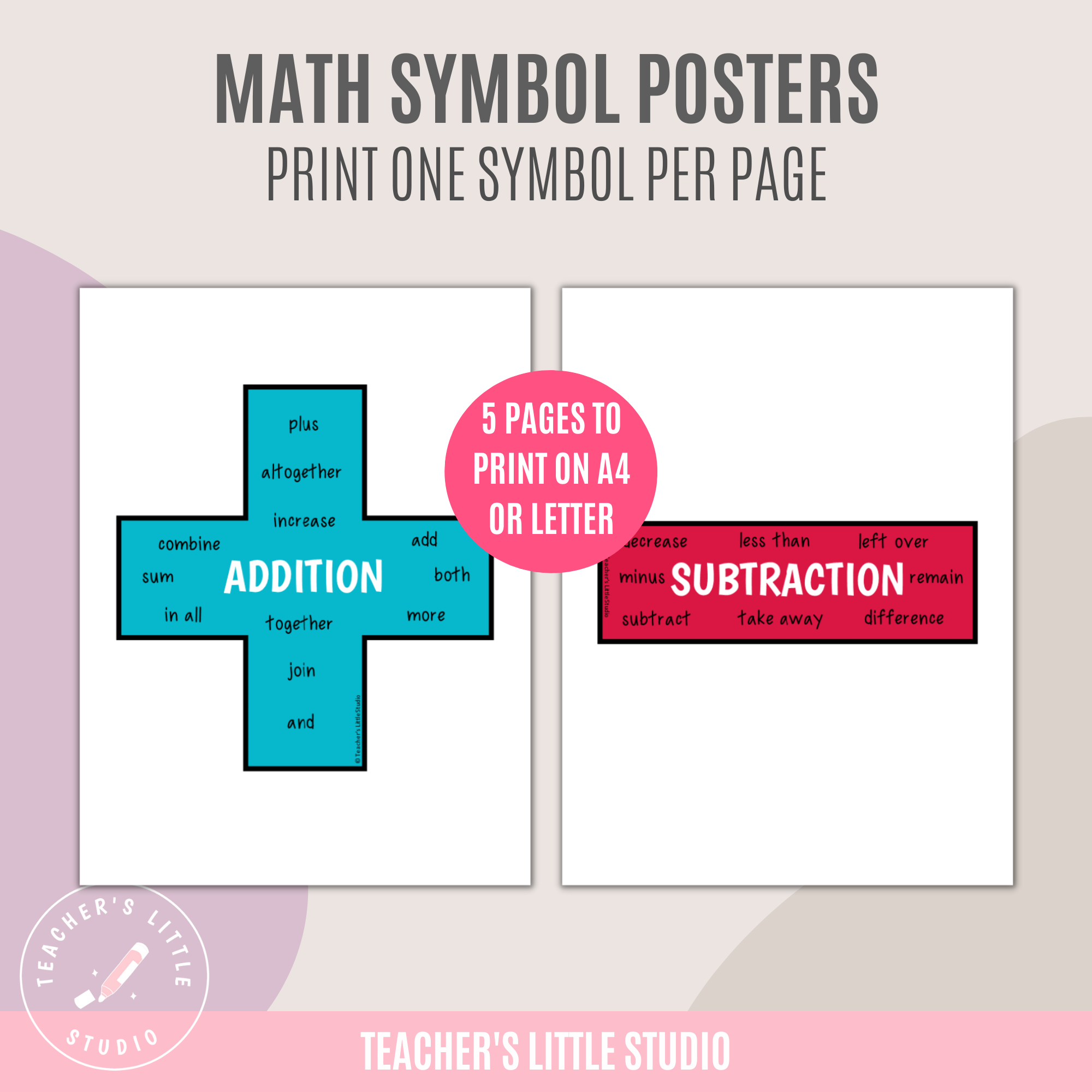 Help students master math operations with these vibrant bright-colored math symbol posters. Perfect for elementary and primary classrooms, these posters clearly display addition, subtraction, multiplication, division, and the equals symbol — each accompanied by key words to support math word problem solving.