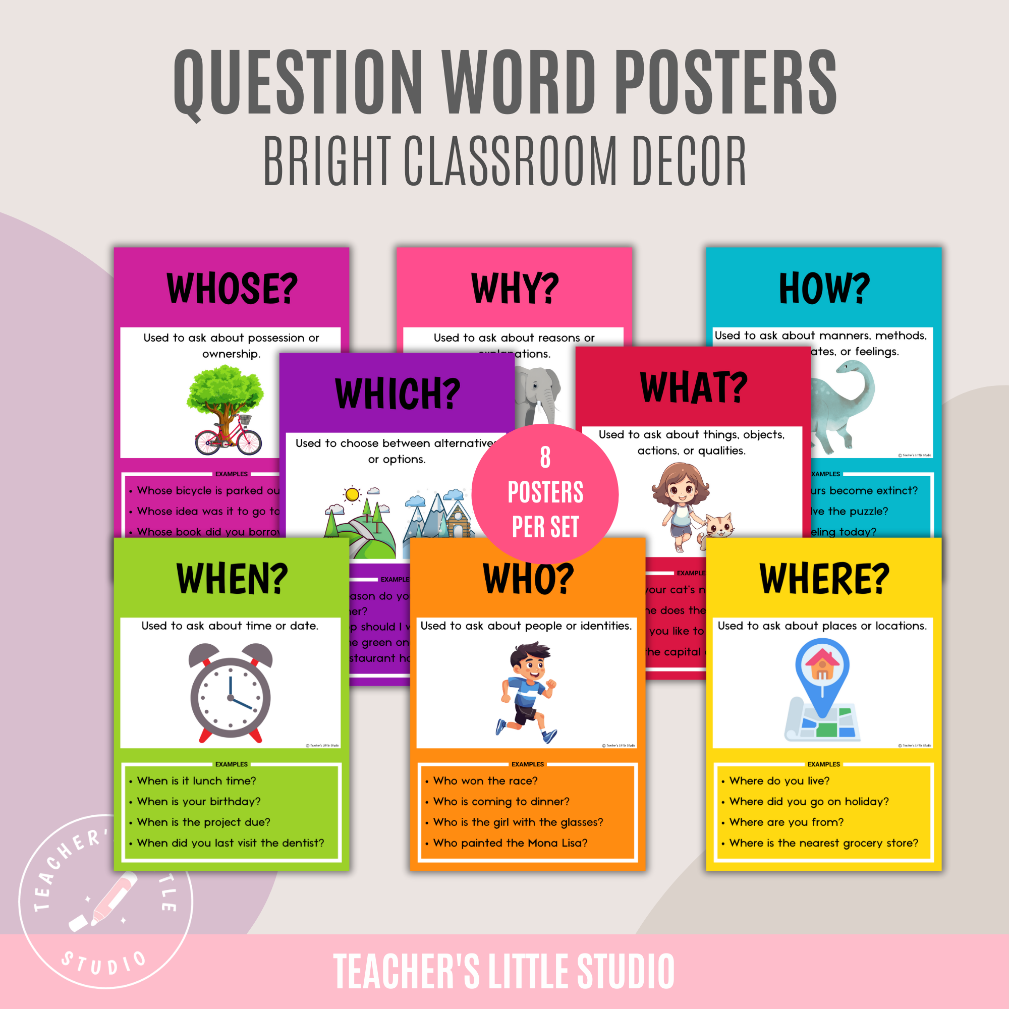 This set includes 8 WH question posters in a vibrant bright color palette. Each poster features: