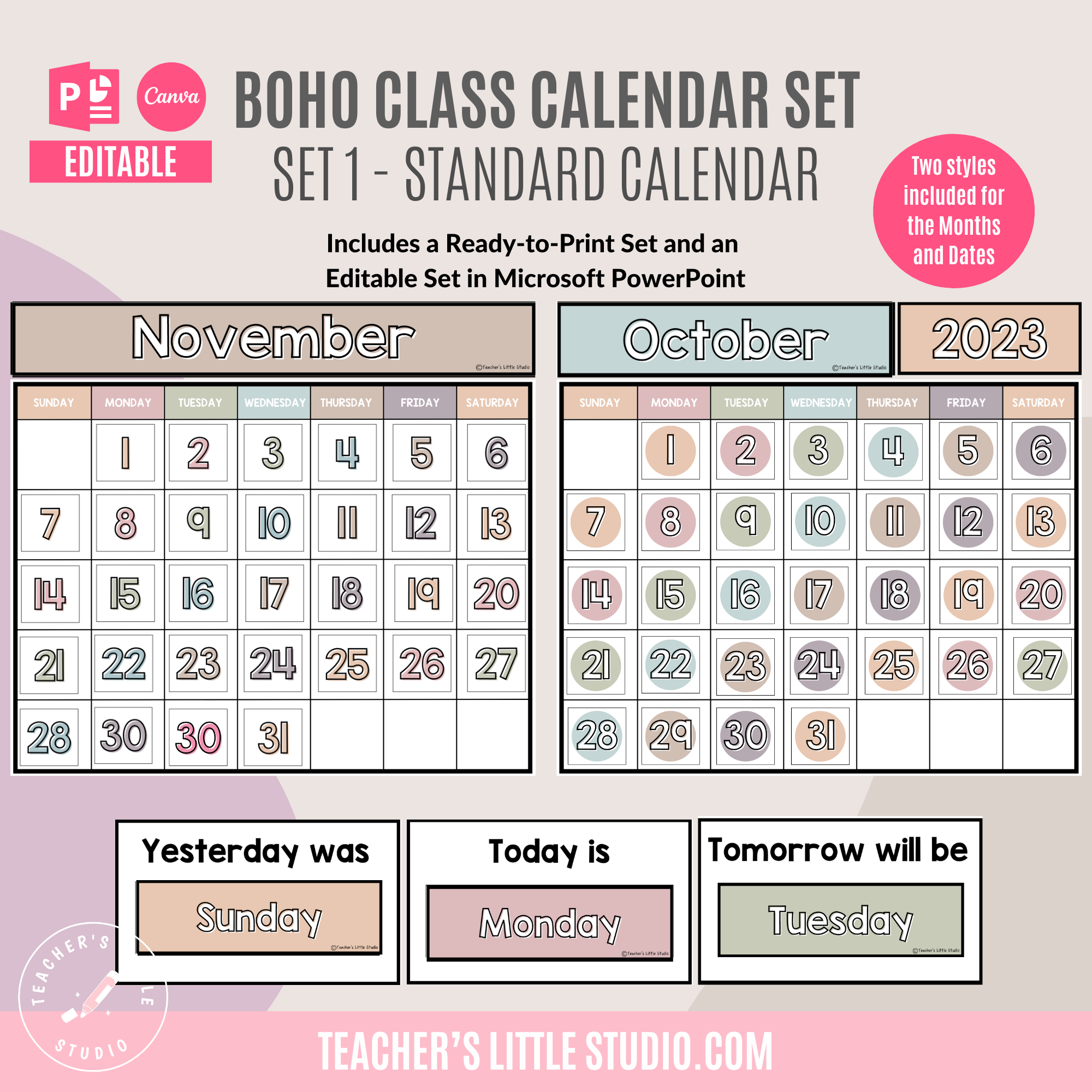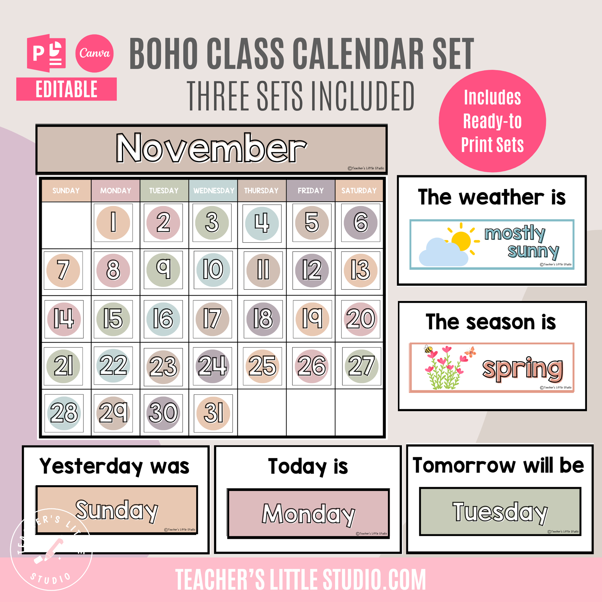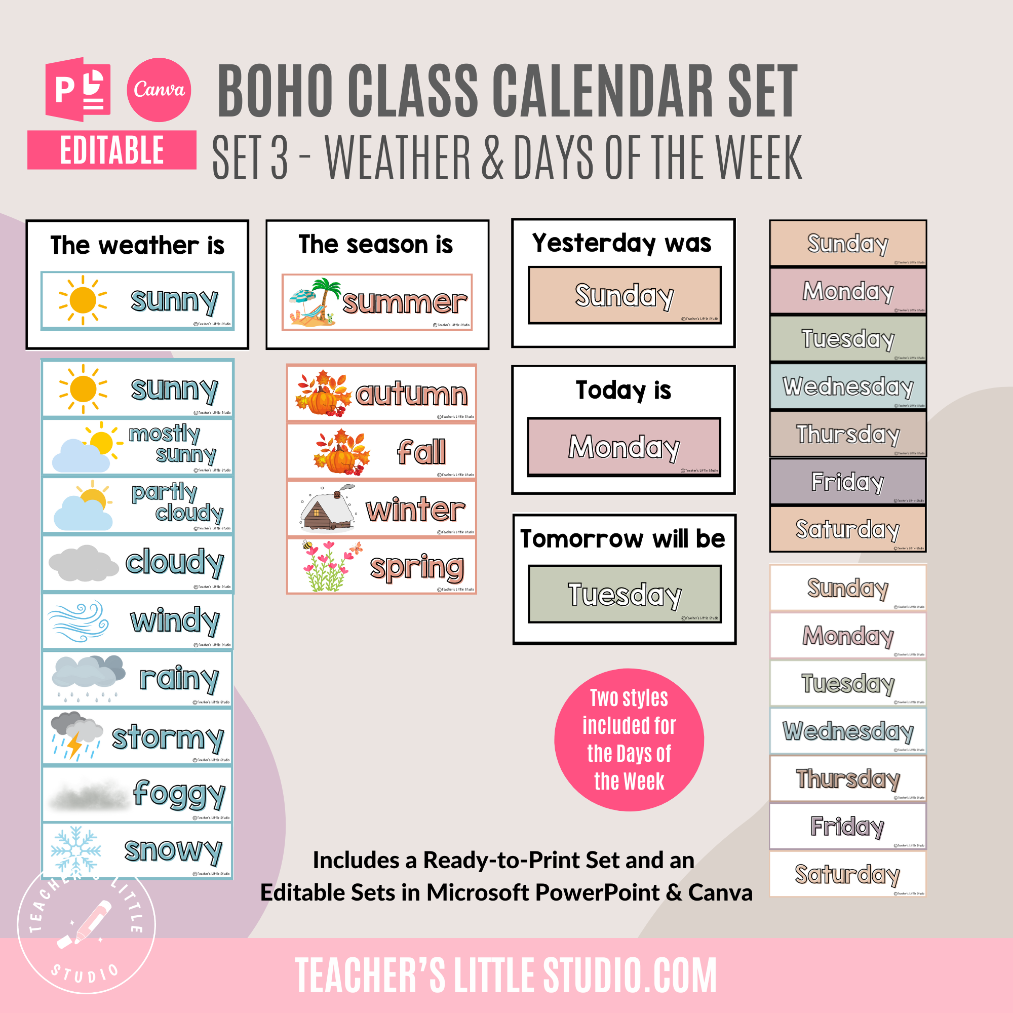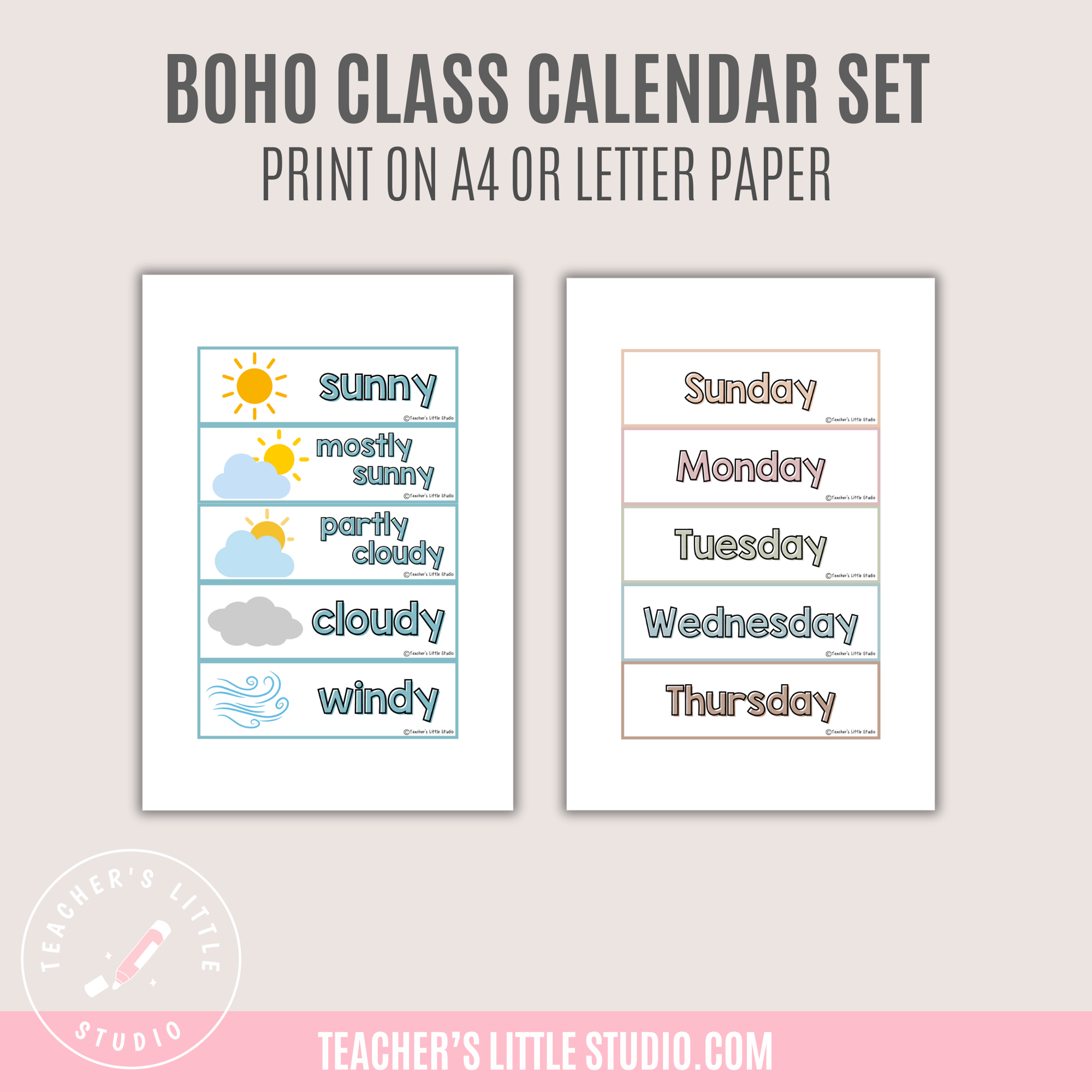 Bring calm and structure to your classroom with this Boho Classroom Calendar and Weather Display Set. Includes ready-to-print charts plus editable templates in Canva and PowerPoint.
