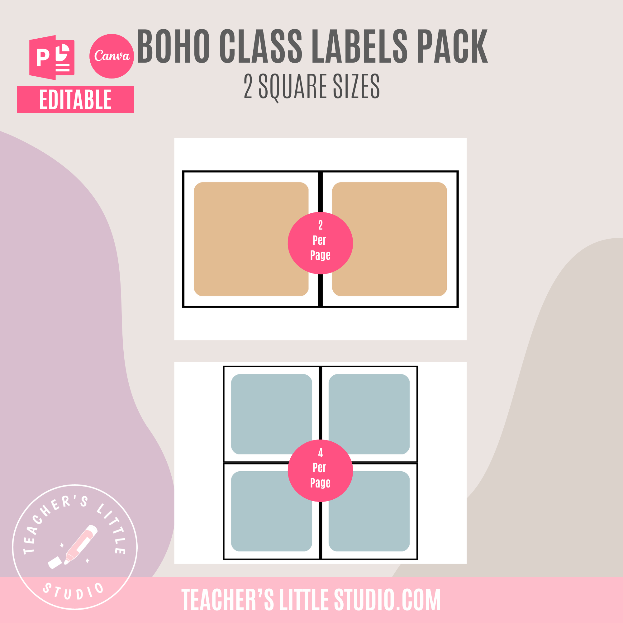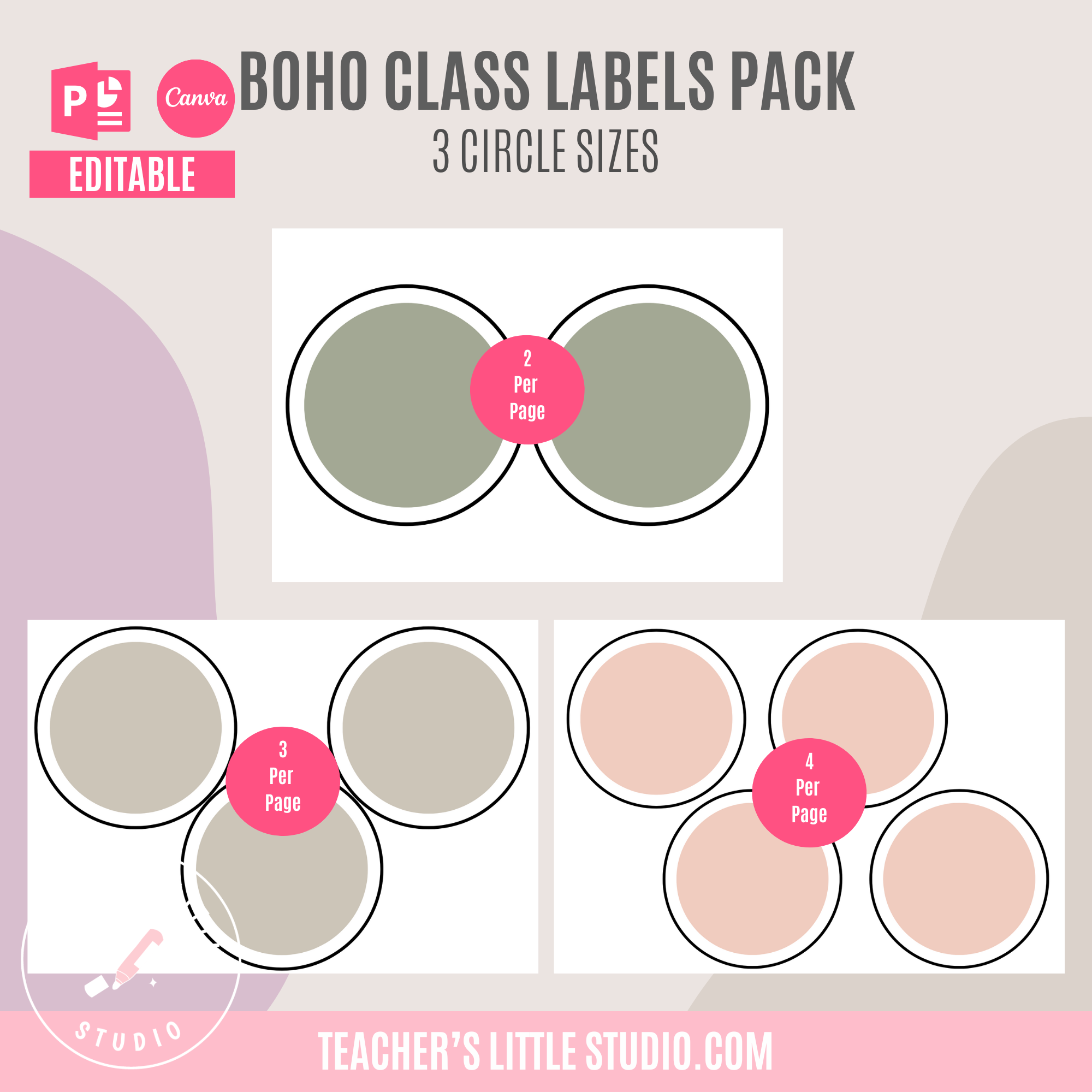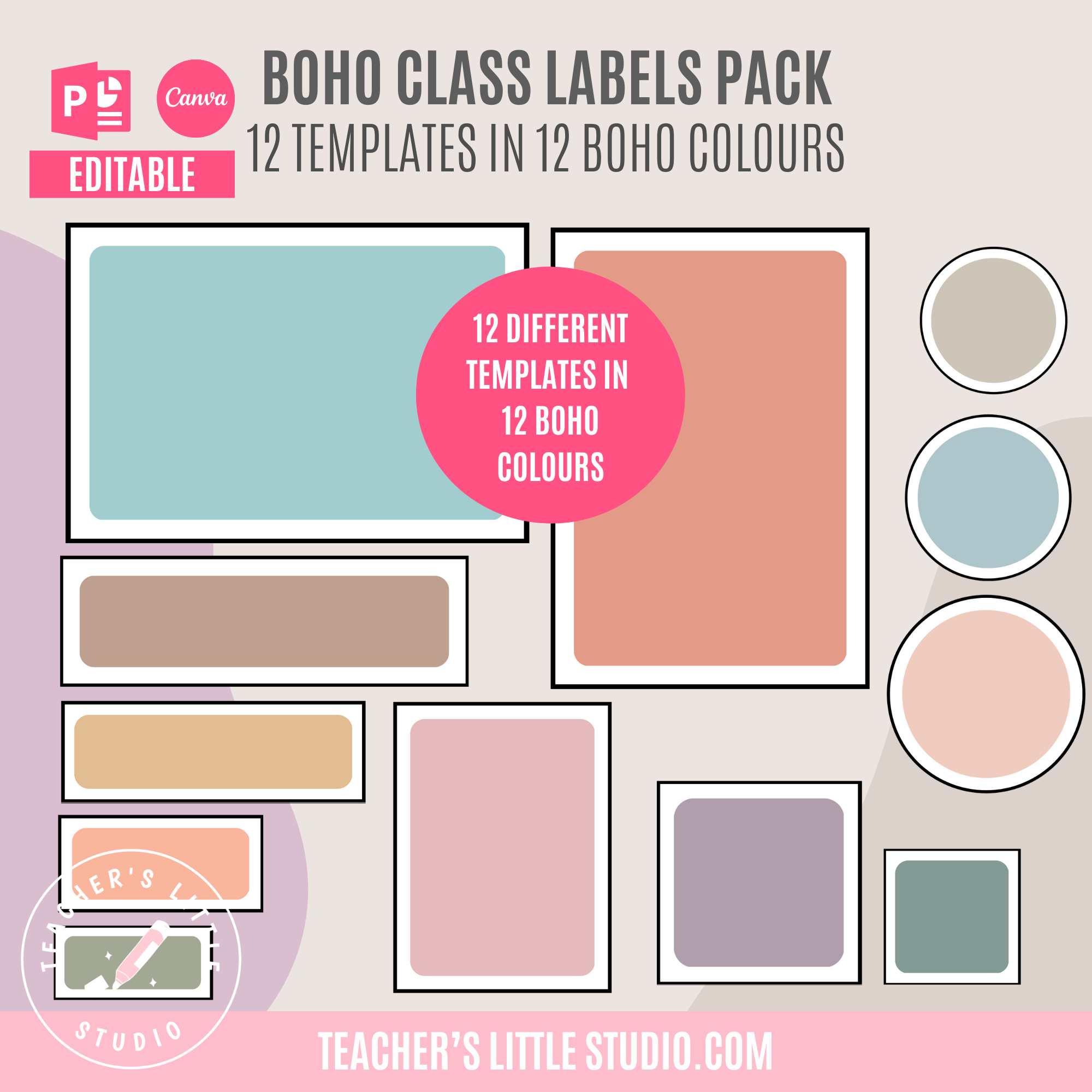 Includes all 12 label template styles in 12 earthy boho colors, plus a complete black and white set, editable in both Canva and PowerPoint, ready for printing.