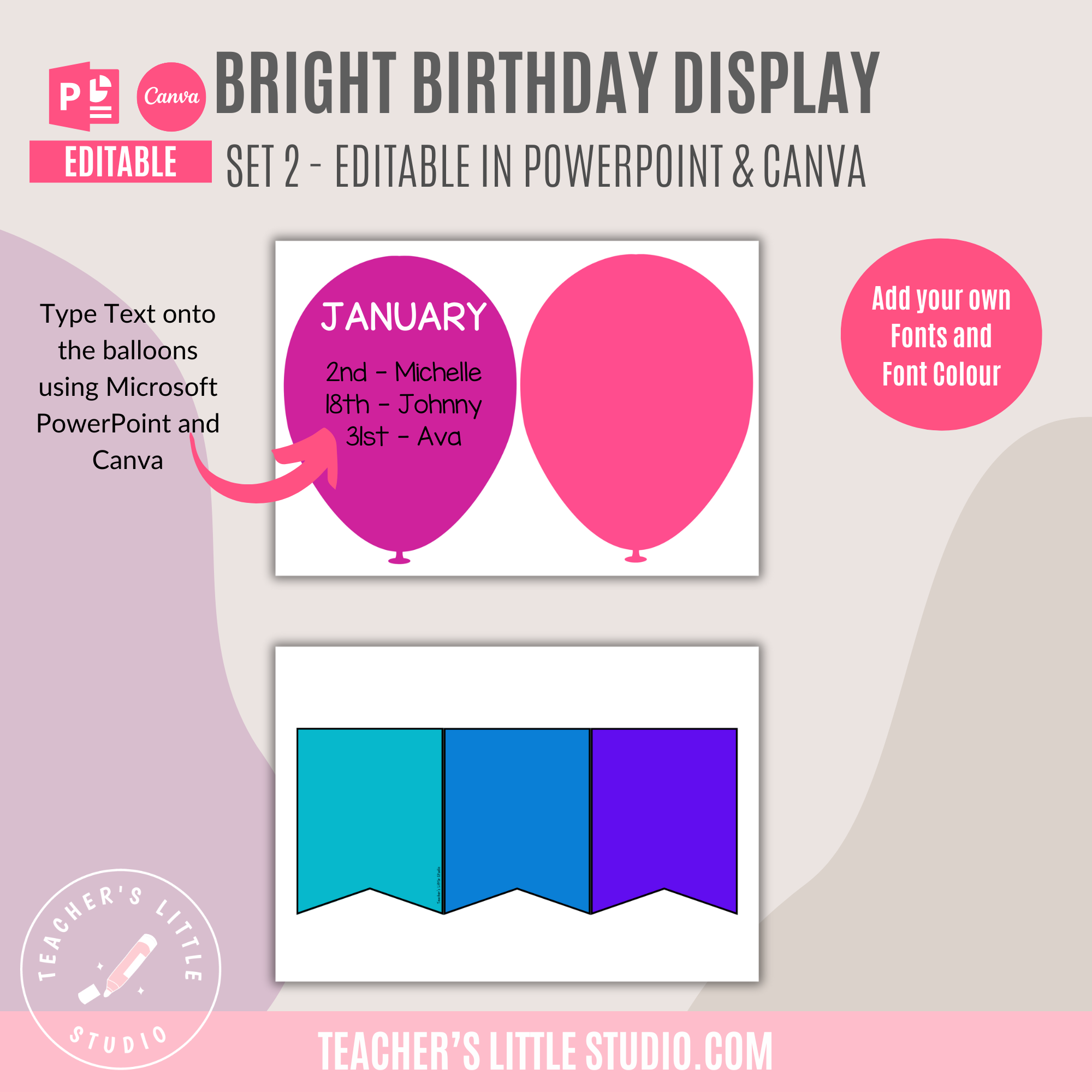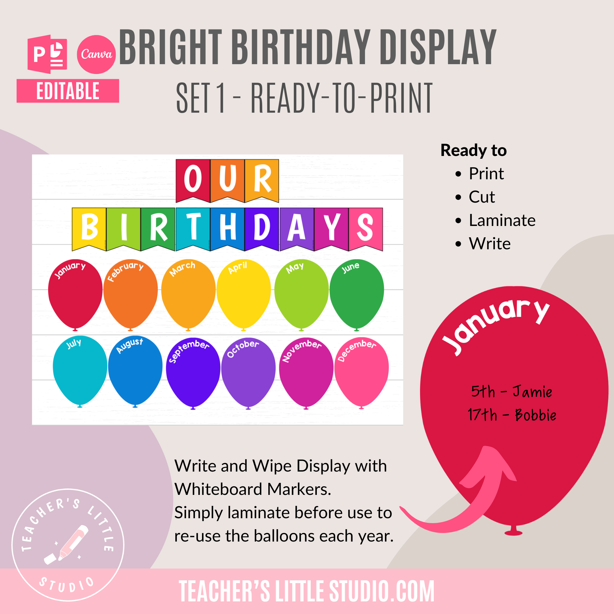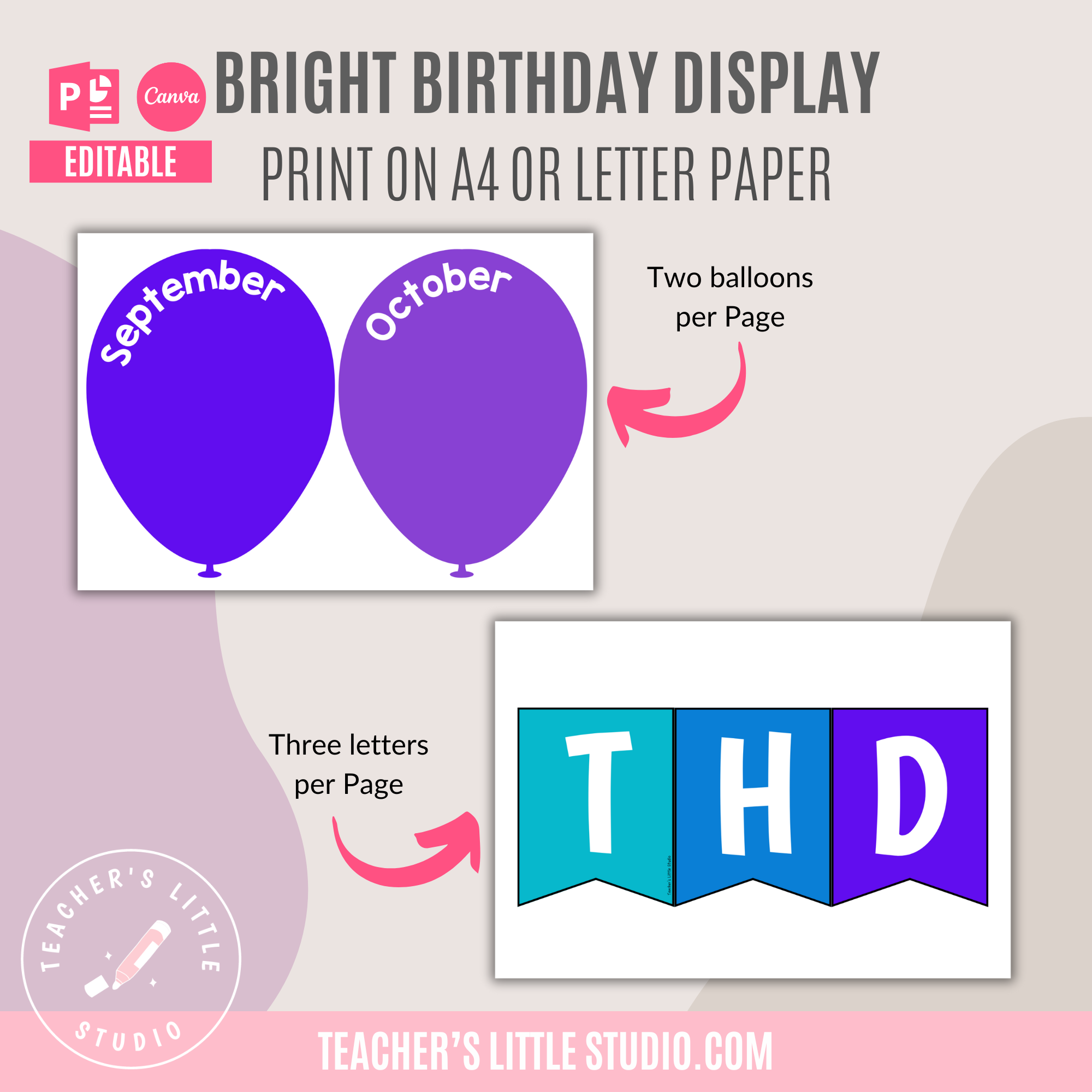 Celebrate birthdays with this Editable Bright Balloon Birthday Display. Includes ready-to-print PDF, editable PowerPoint, and Canva templates.