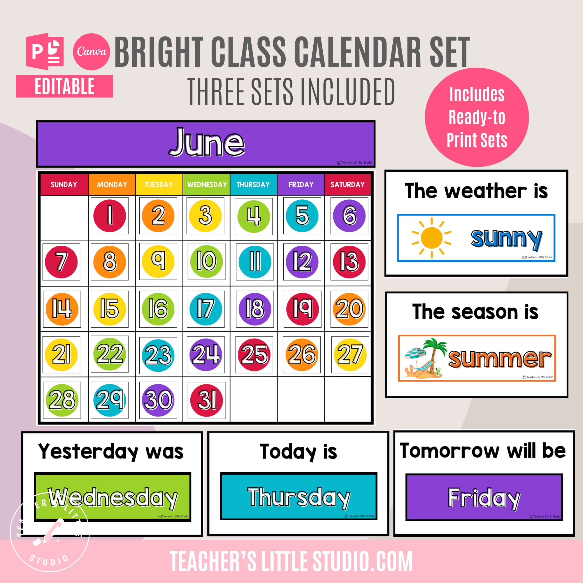 Bring calm and structure to your classroom with this Bright Classroom Calendar and Weather Display Set. Includes ready-to-print charts plus editable templates in Canva and PowerPoint.