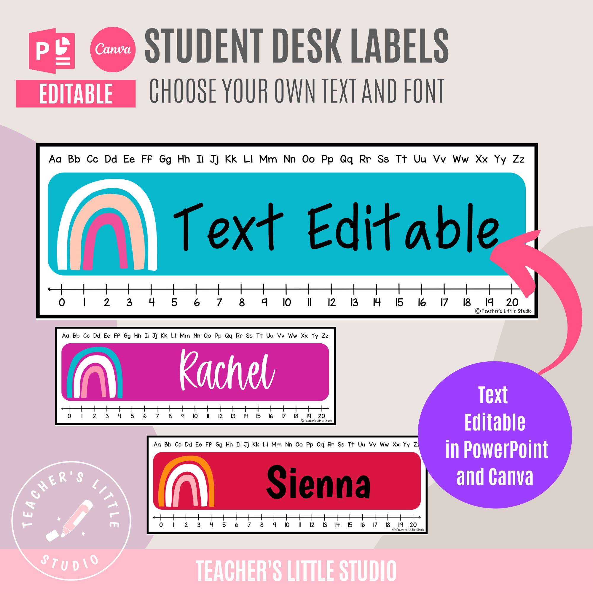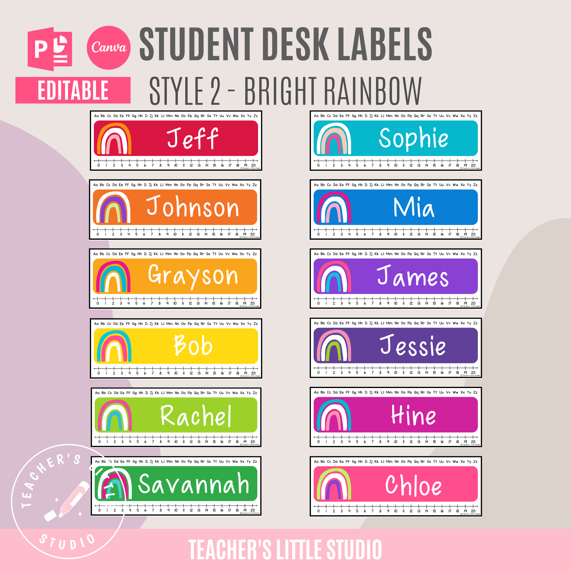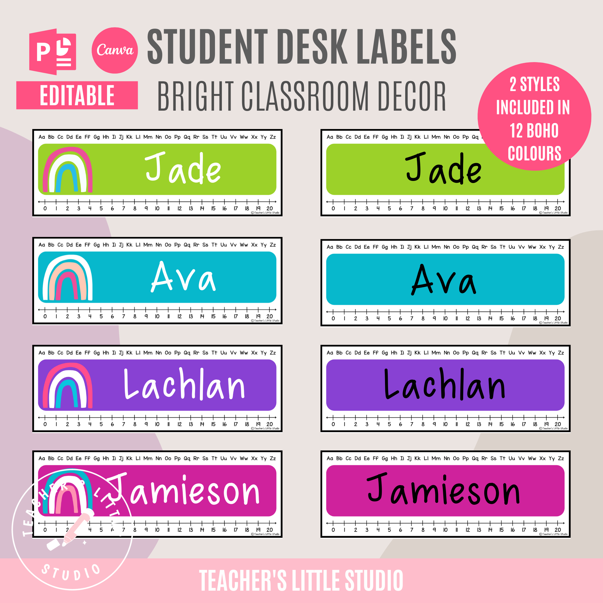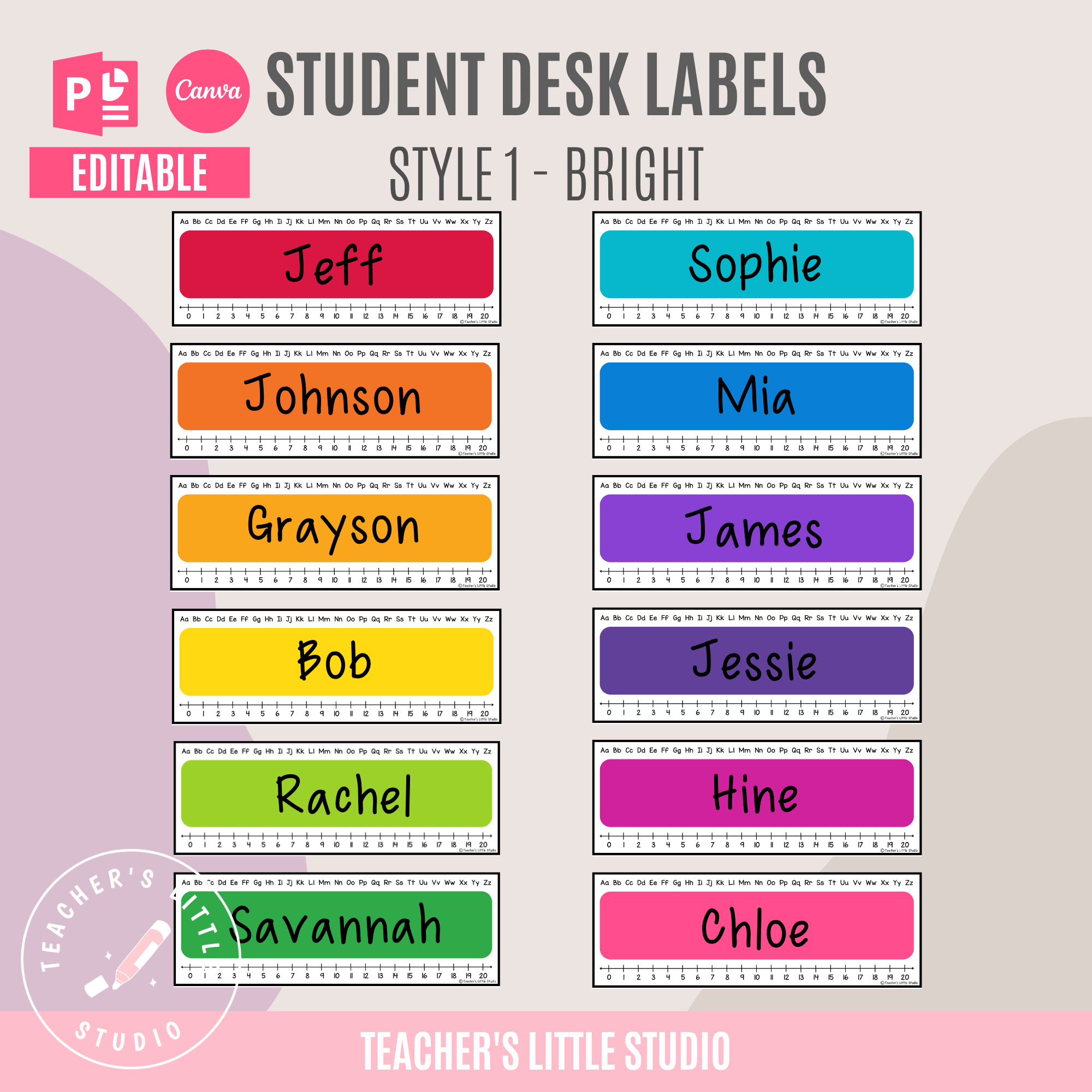 Editable bright student desk labels in 12 vibrant colors. Includes Bright Minimalist and Bright Rainbow styles. Perfect for classroom name tags, editable in PowerPoint and Canva.