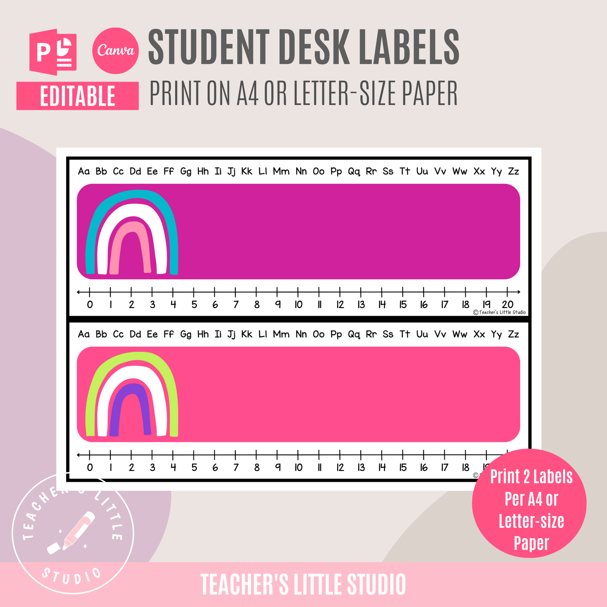 The desk labels are fully editable in PowerPoint and Canva, giving you flexibility to customize student names and classroom details. Each template is set up on A4 paper with two desk labels per page, and they can easily be printed on A4 or adjusted to fit US Letter size.