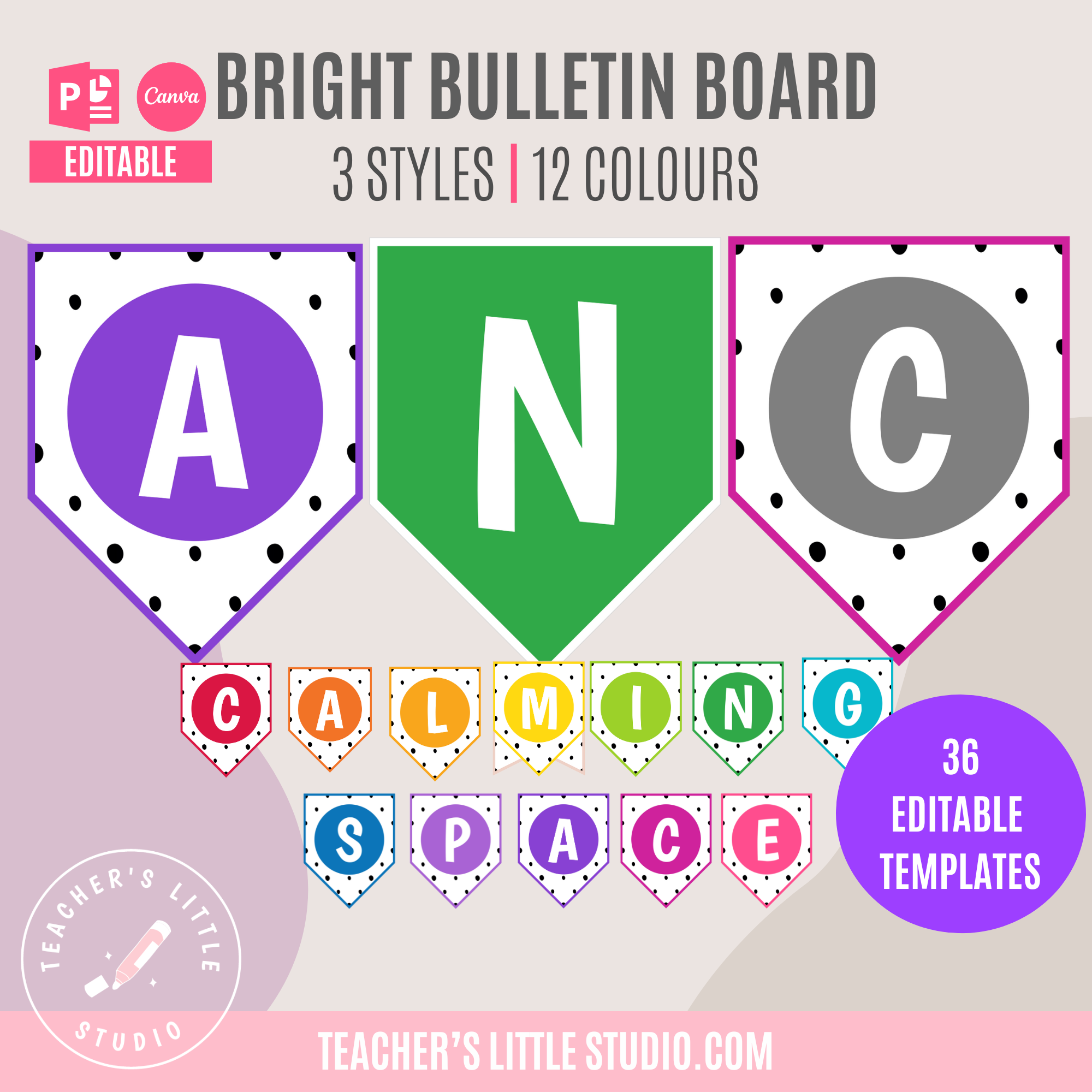 Create stunning bulletin boards with this bright spearhead classroom banner set – the perfect addition to your classroom display, ESL resources, or homeschool environment. Designed in a spearhead shape with three unique styles and 12 vibrant bright colors, these editable bunting templates allow you to customize your own text in PowerPoint or Canva.