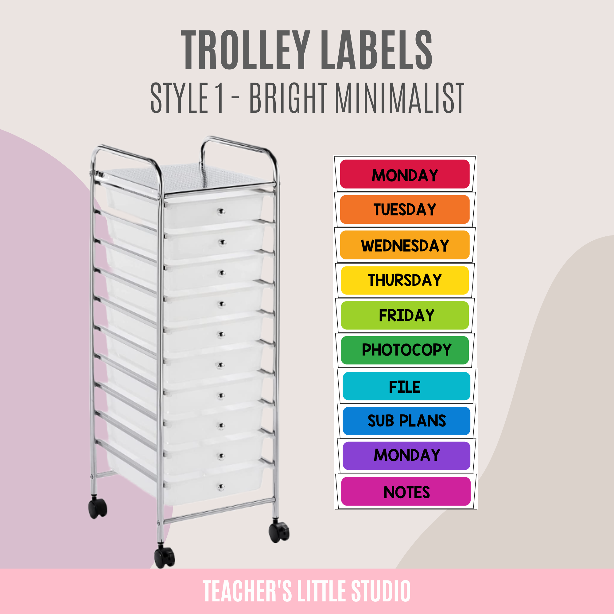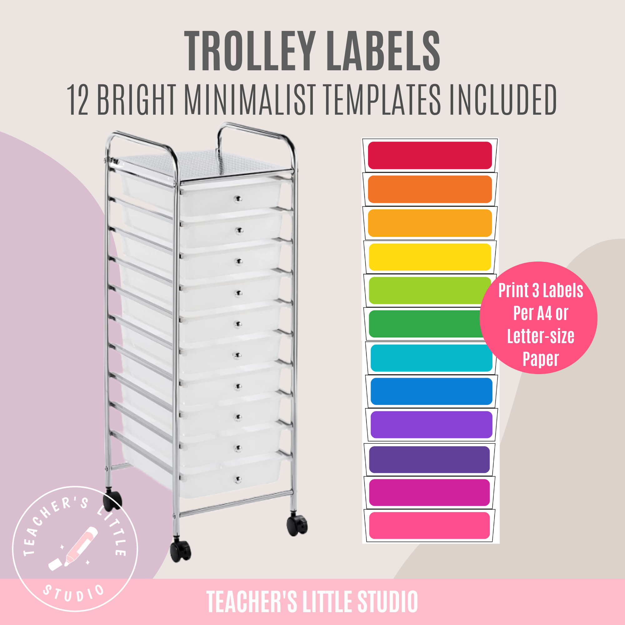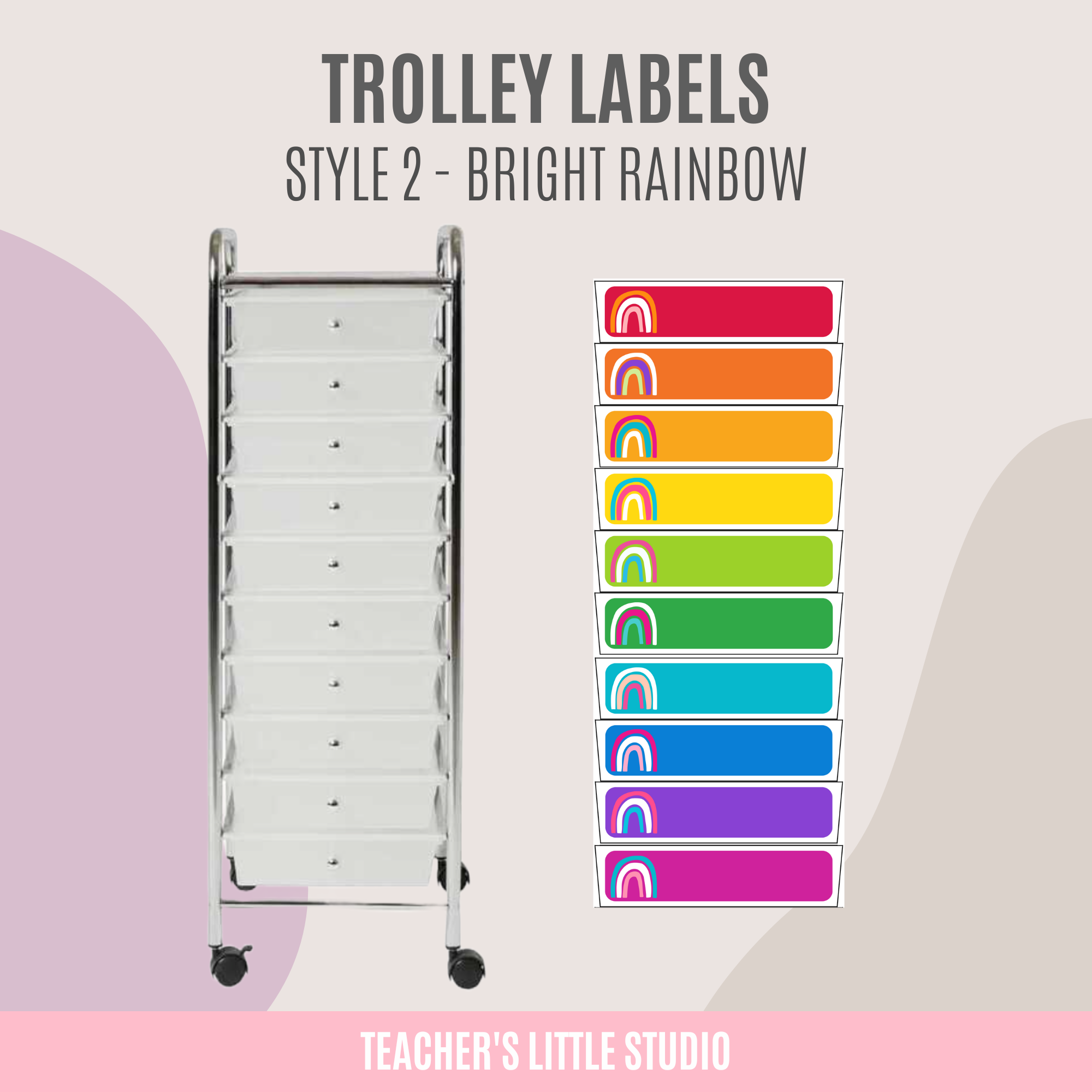 Organize your classroom in style with Editable Bright Trolley Labels. Customizable in Canva & PowerPoint and printable for 10-drawer trolley carts, these labels come in Bright Minimalist and Bright Rainbow designs.