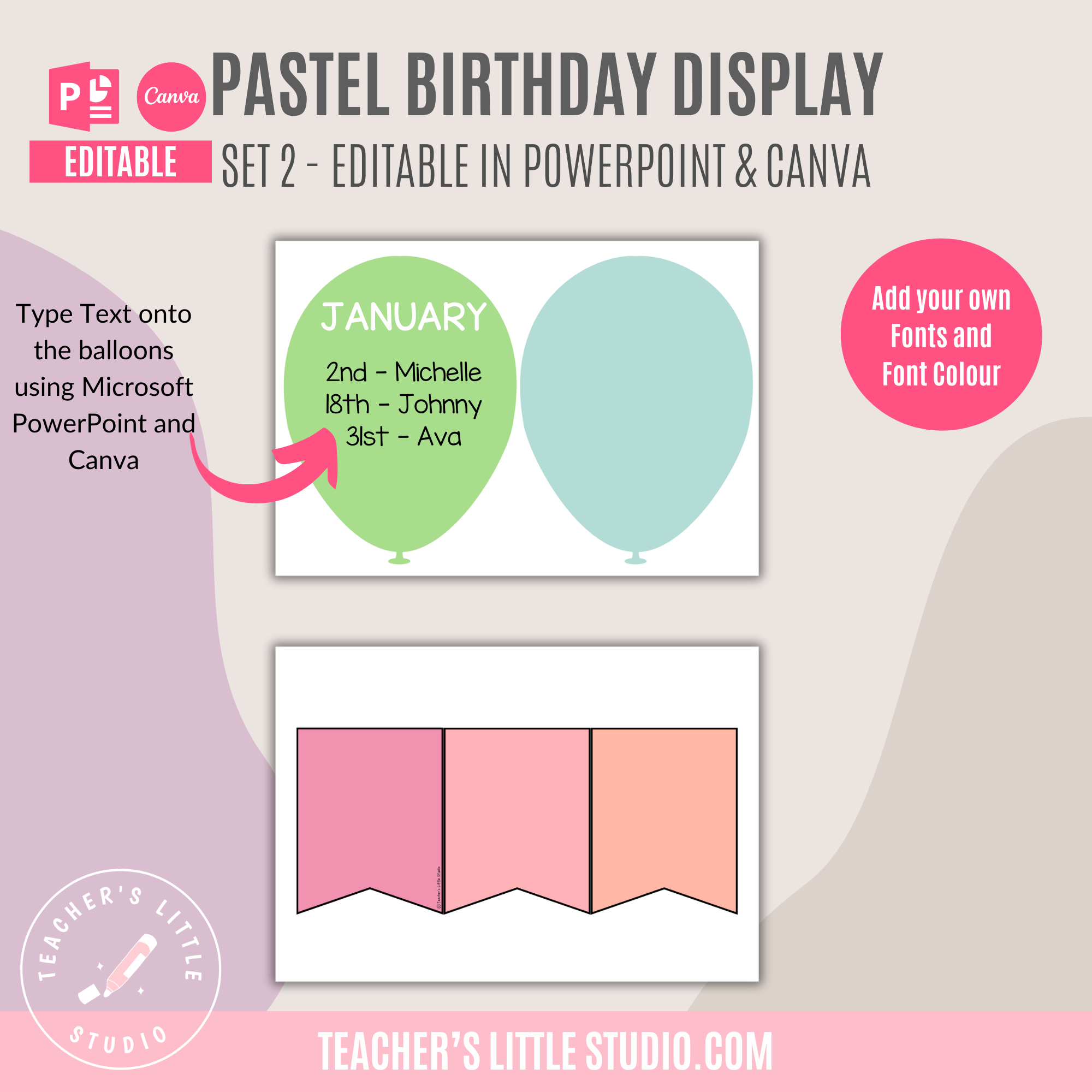 Celebrate birthdays with this Editable Pastel Balloon Birthday Display. Includes ready-to-print PDF, editable PowerPoint, and Canva templates.