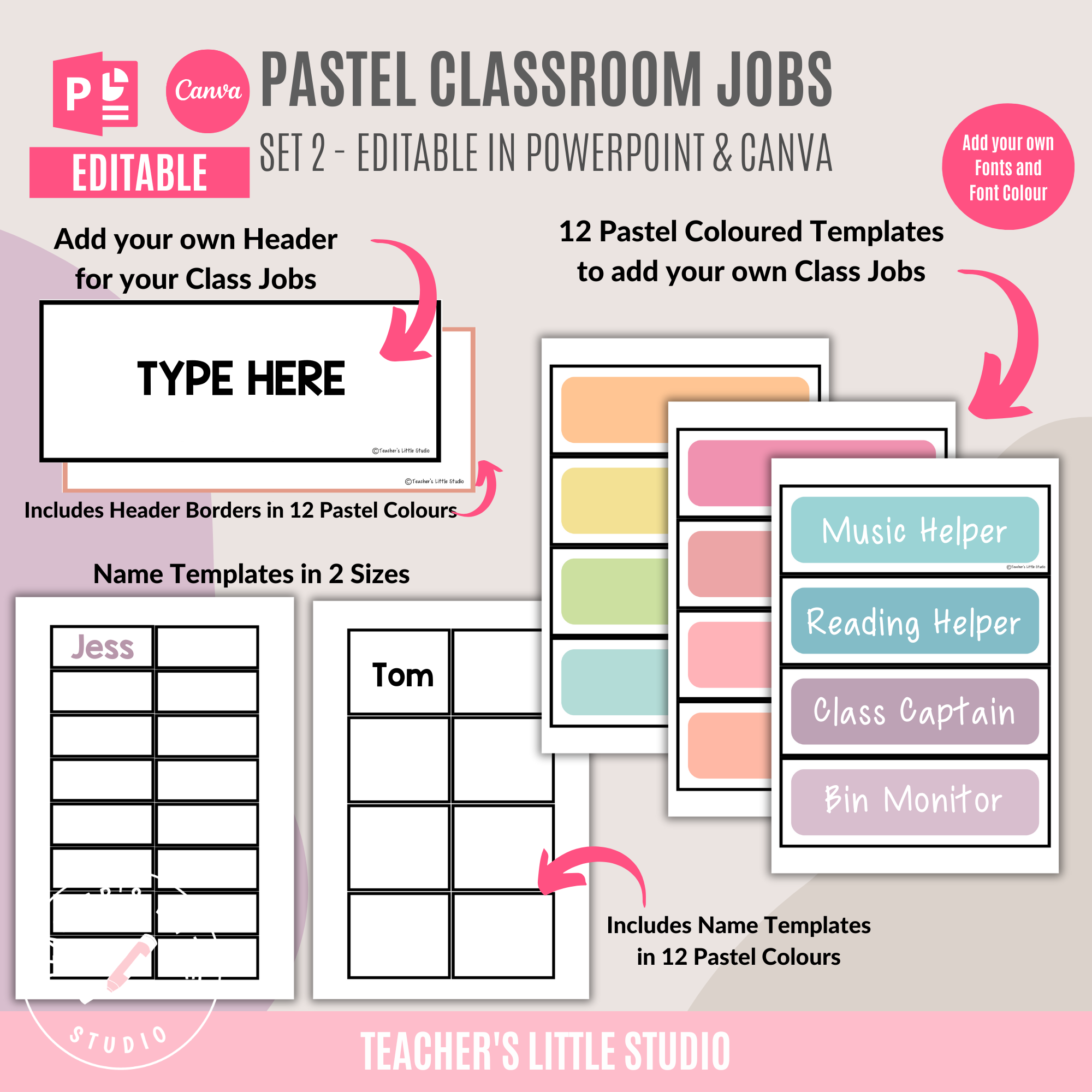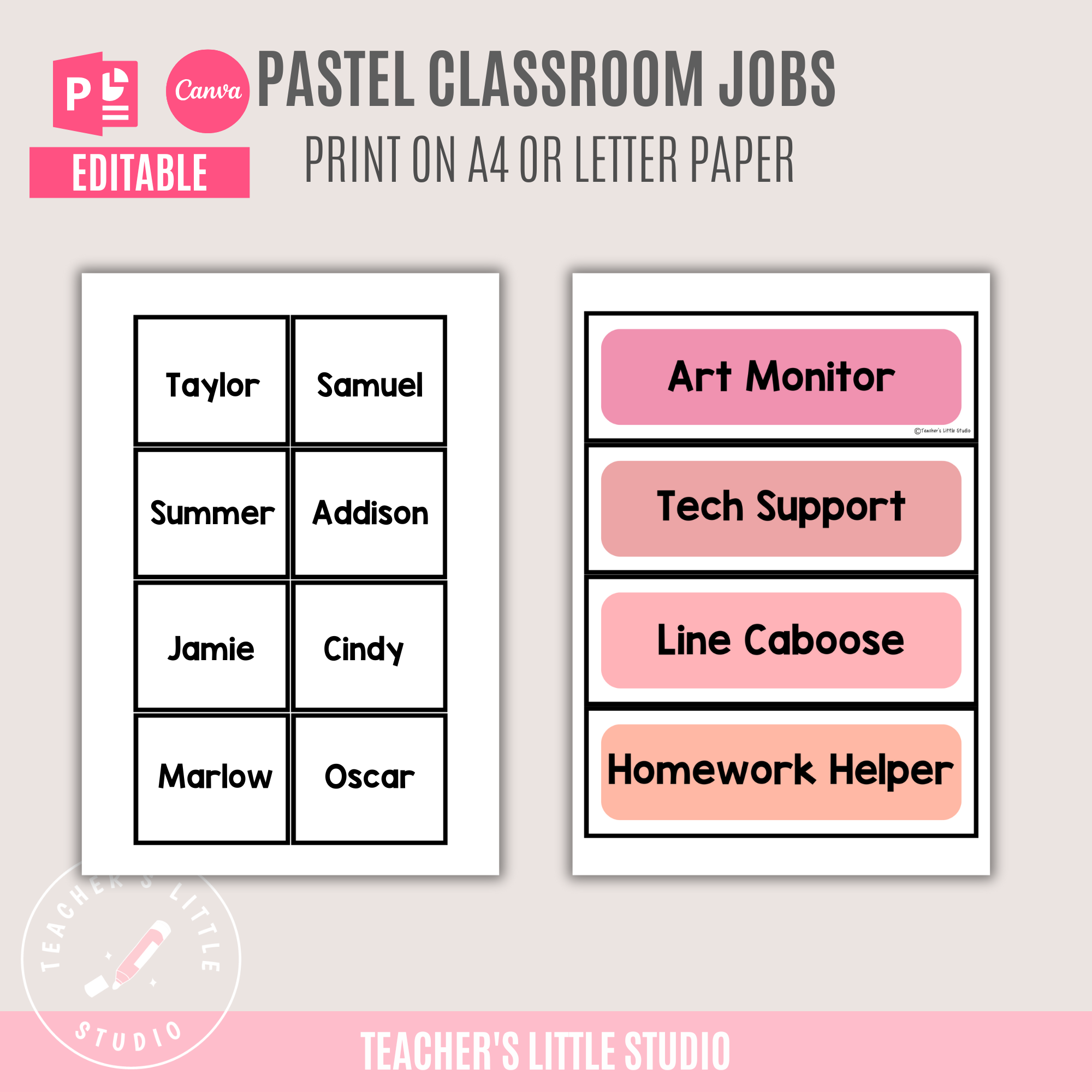 The set comes with ready-to-print classroom job cards plus fully editable templates in Canva and Microsoft PowerPoint, so you can easily add your own jobs and student names.
