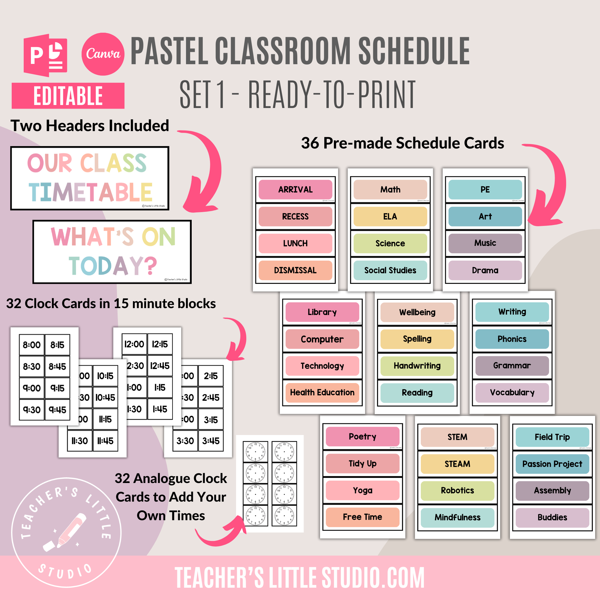 Whether you need editable class timetable templates, visual schedule cards for kids, or clock labels to teach time, this set has everything you need to keep your day on track.
