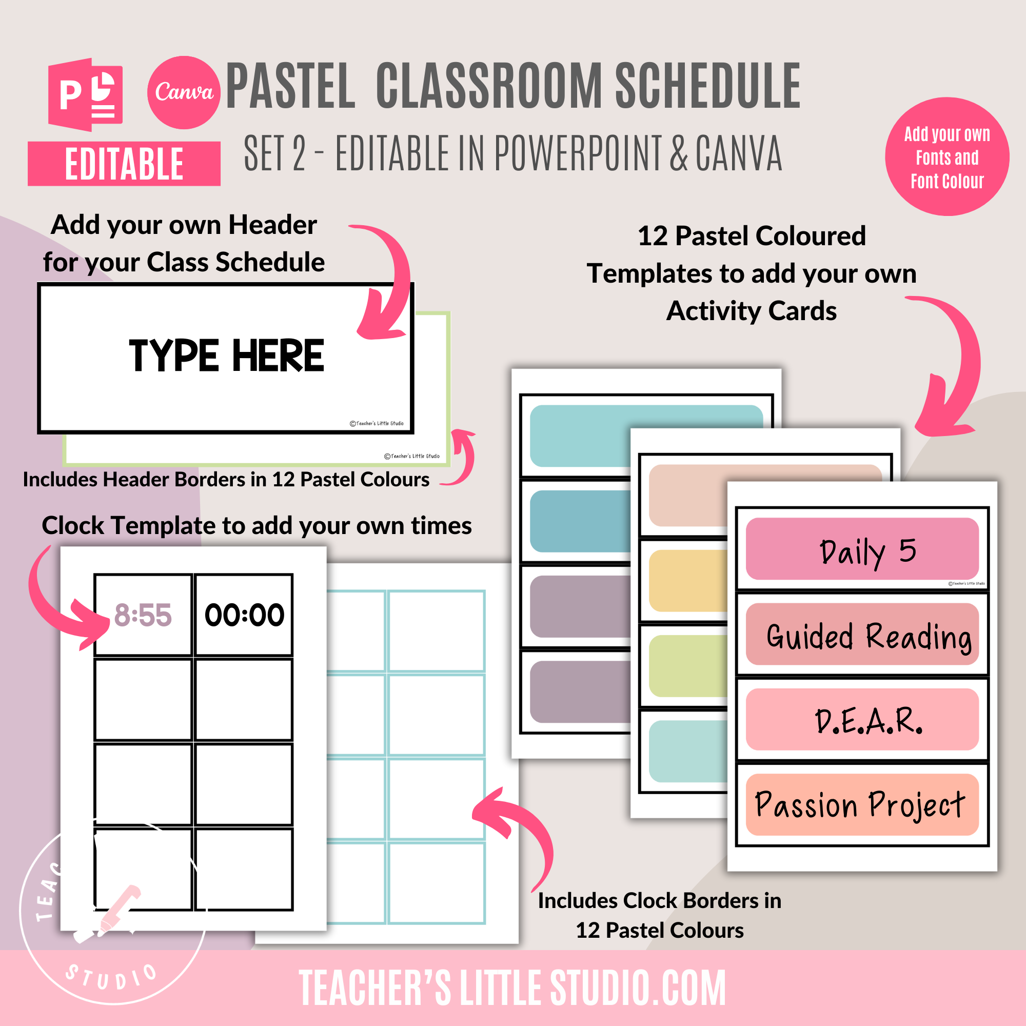 This Classroom Schedule set helps keep your class on track with ready-to-print schedule cards, clock labels, and editable templates in Canva and PowerPoint. Designed in a calming pastel palette, perfect for classrooms and homeschool.
