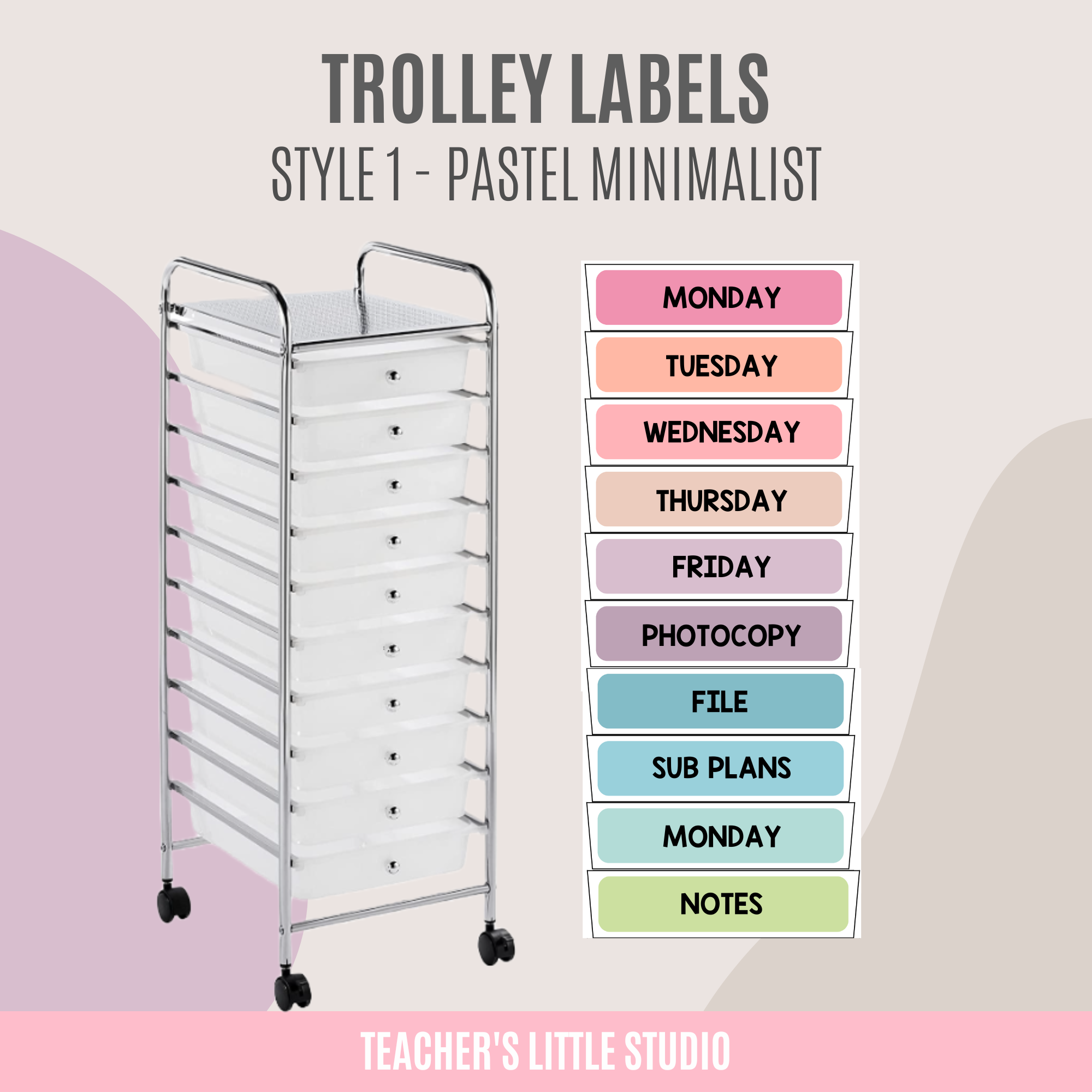 Organize your classroom in style with Editable Pastel Trolley Labels. Customizable in Canva & PowerPoint and printable for 10-drawer trolley carts, these labels come in Pastel Minimalist and Pastel Rainbow designs.