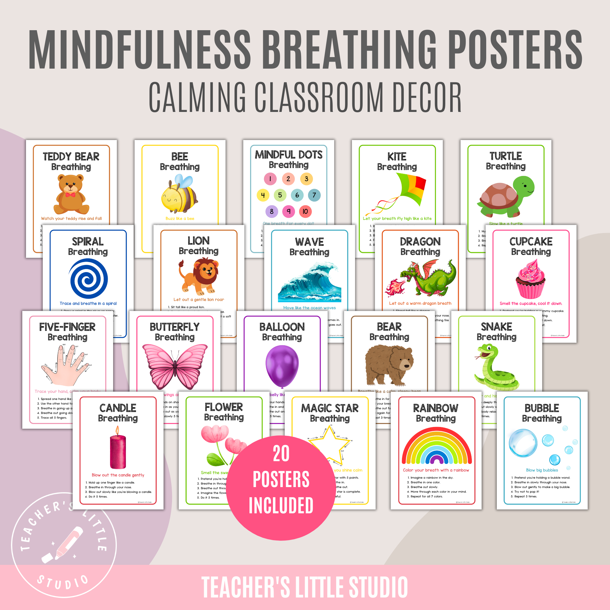 Support calm, focus, and emotional wellbeing in children with this set of 20 Mindful Breathing Posters. Perfect for teachers, counselors, parents, and caregivers, these posters are designed for children aged 4–8 and feature fun, kid-friendly breathing techniques using playful themes like animals, nature, cupcakes, bubbles, bears, and dragons.