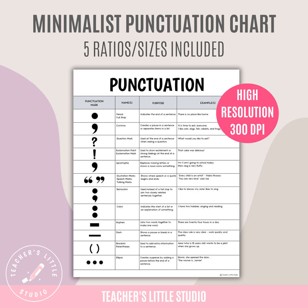 This Minimalist Punctuation Chart is a one-page printable perfect for student workbooks or classroom display. Includes 12 punctuation marks with examples in high-resolution PDF and JPG files.