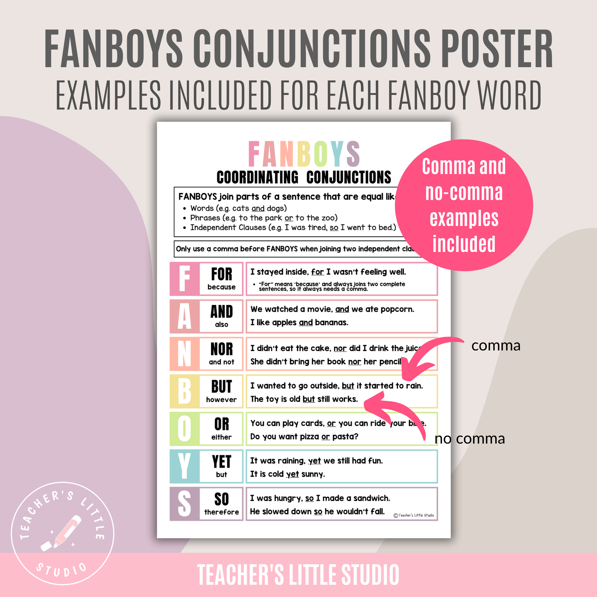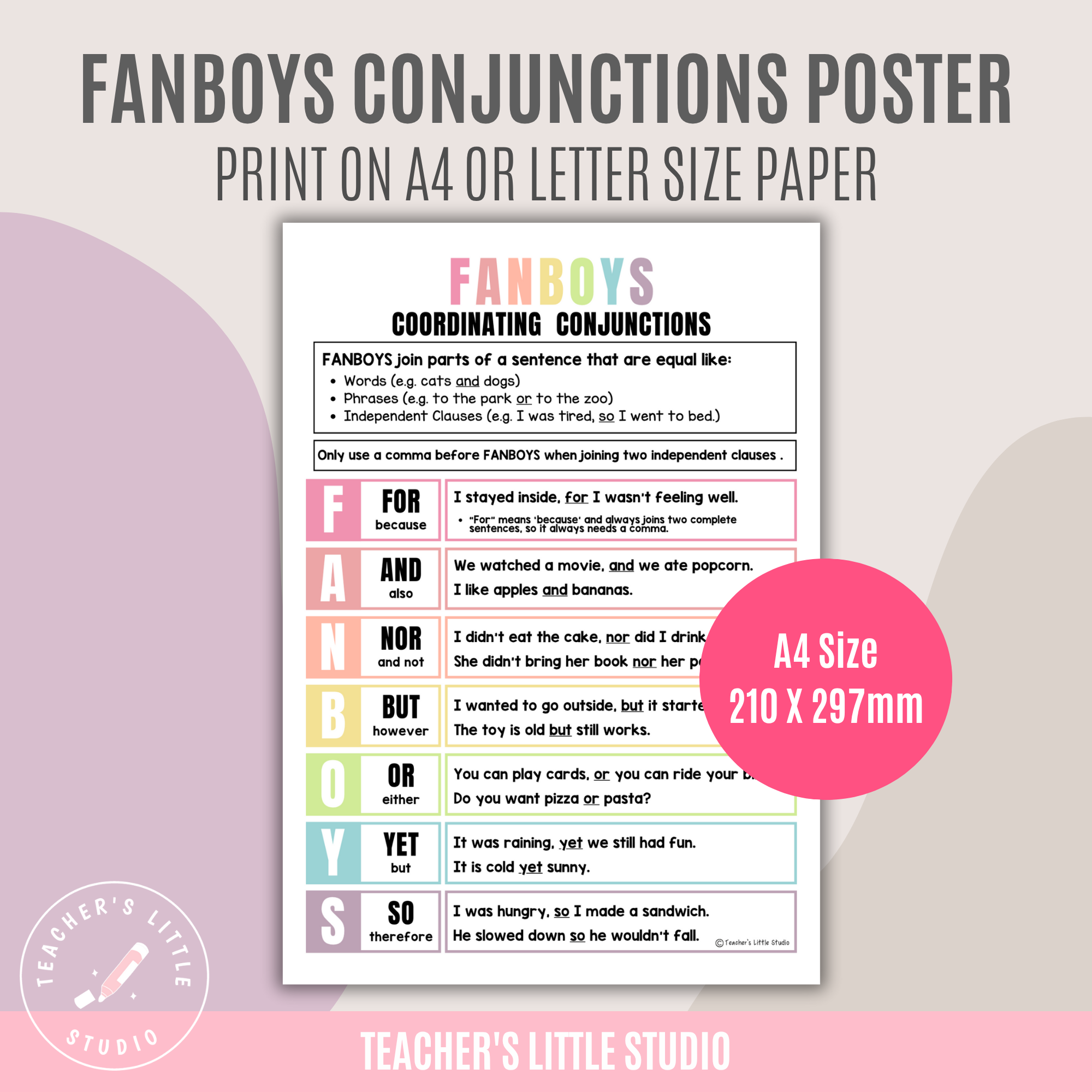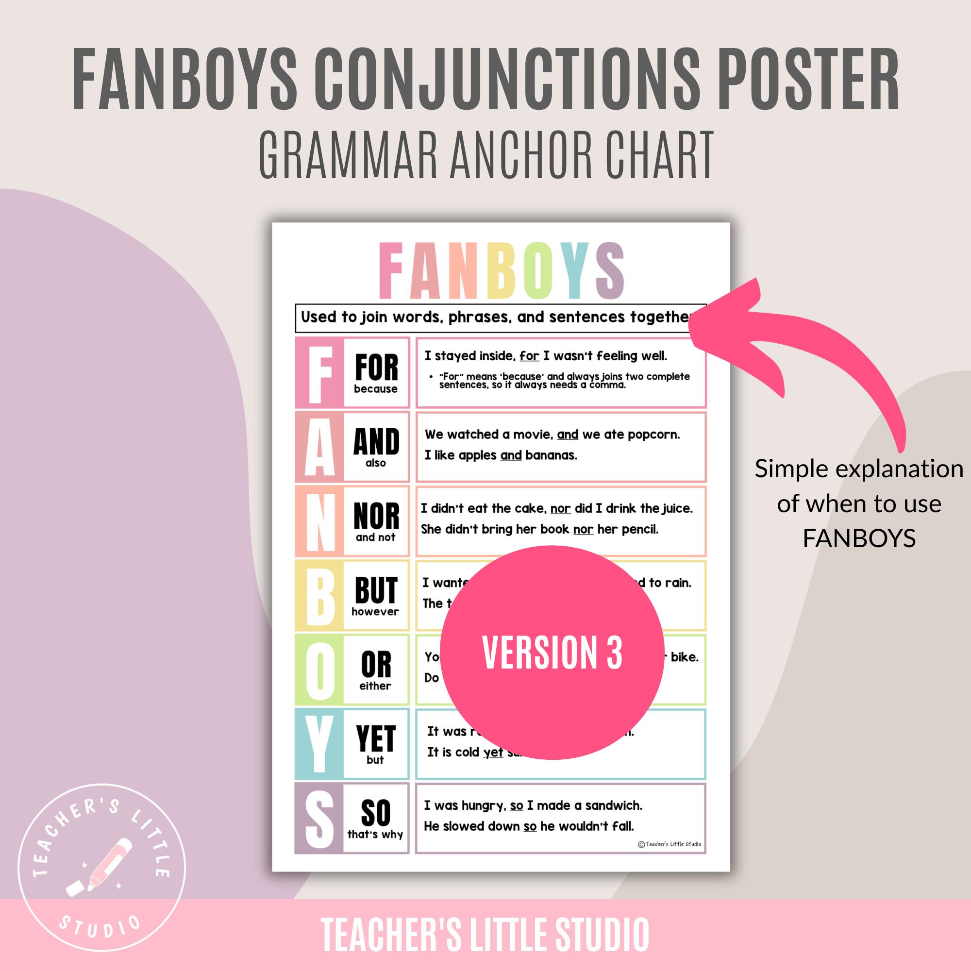 Make grammar lessons clear and engaging with this FANBOYS Conjunction Poster Set, designed to help students understand coordinating conjunctions and how they work in sentences. These posters make it easier for learners to see when to use commas, how to join ideas, and how to apply FANBOYS words in their own writing.