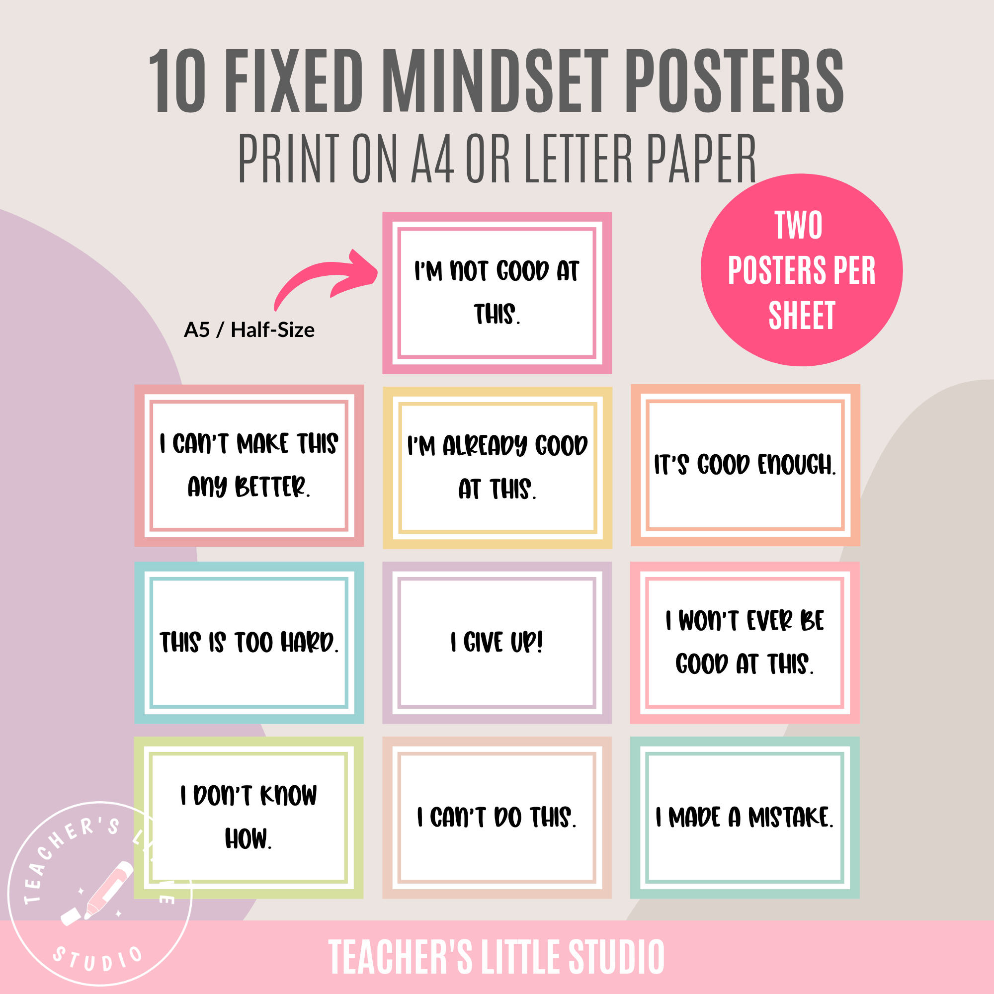 Decorate your classroom with 10 Pastel Growth Mindset Posters. Includes positive Growth Mindset sayings, matching Fixed Mindset reminders, and a display header.