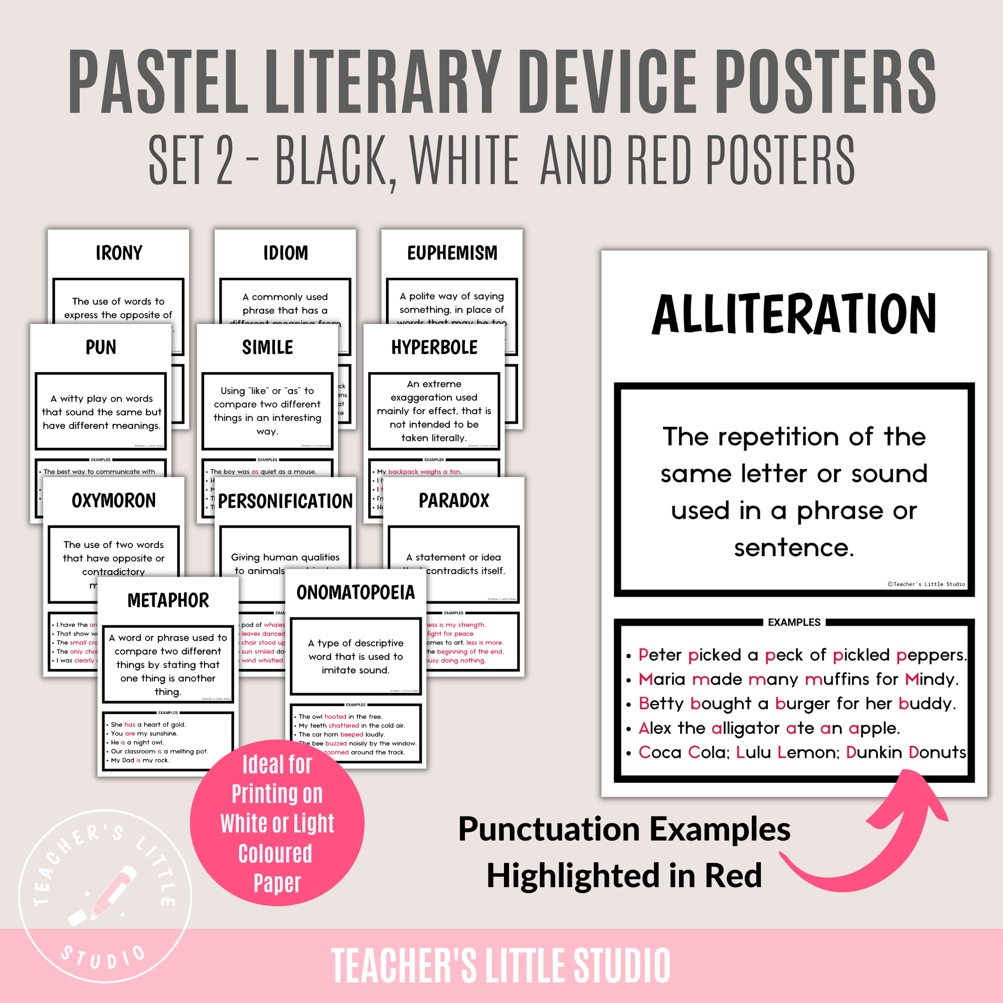 ★ A set of Black, White and Red Posters, ideal for printing on white paper, to highlight the usage of Literary Devices in red.