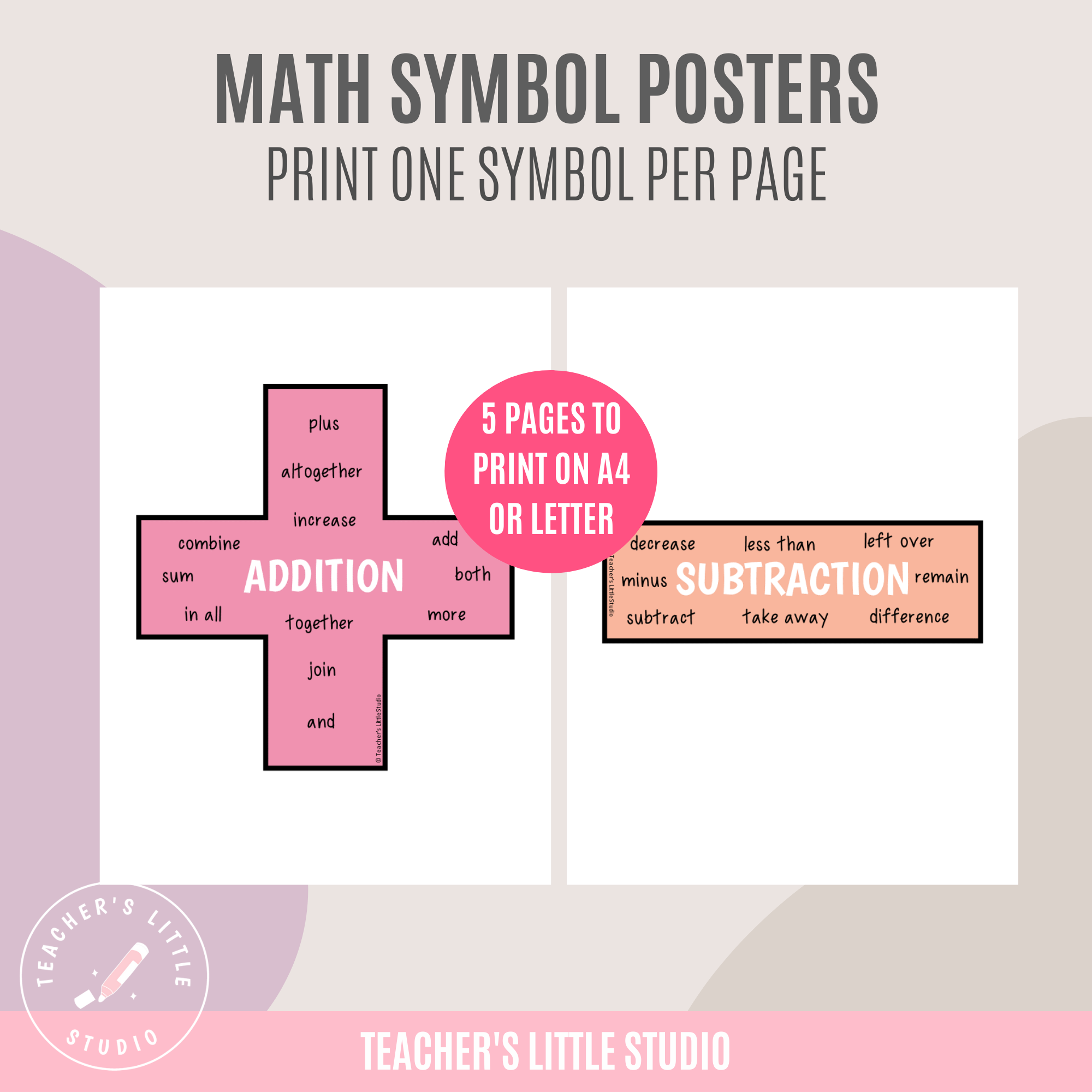 Help students master math operations with these calming pastel-colored math symbol posters. Perfect for elementary and primary classrooms, these posters clearly display addition, subtraction, multiplication, division, and the equals symbol — each accompanied by key words to support math word problem solving.