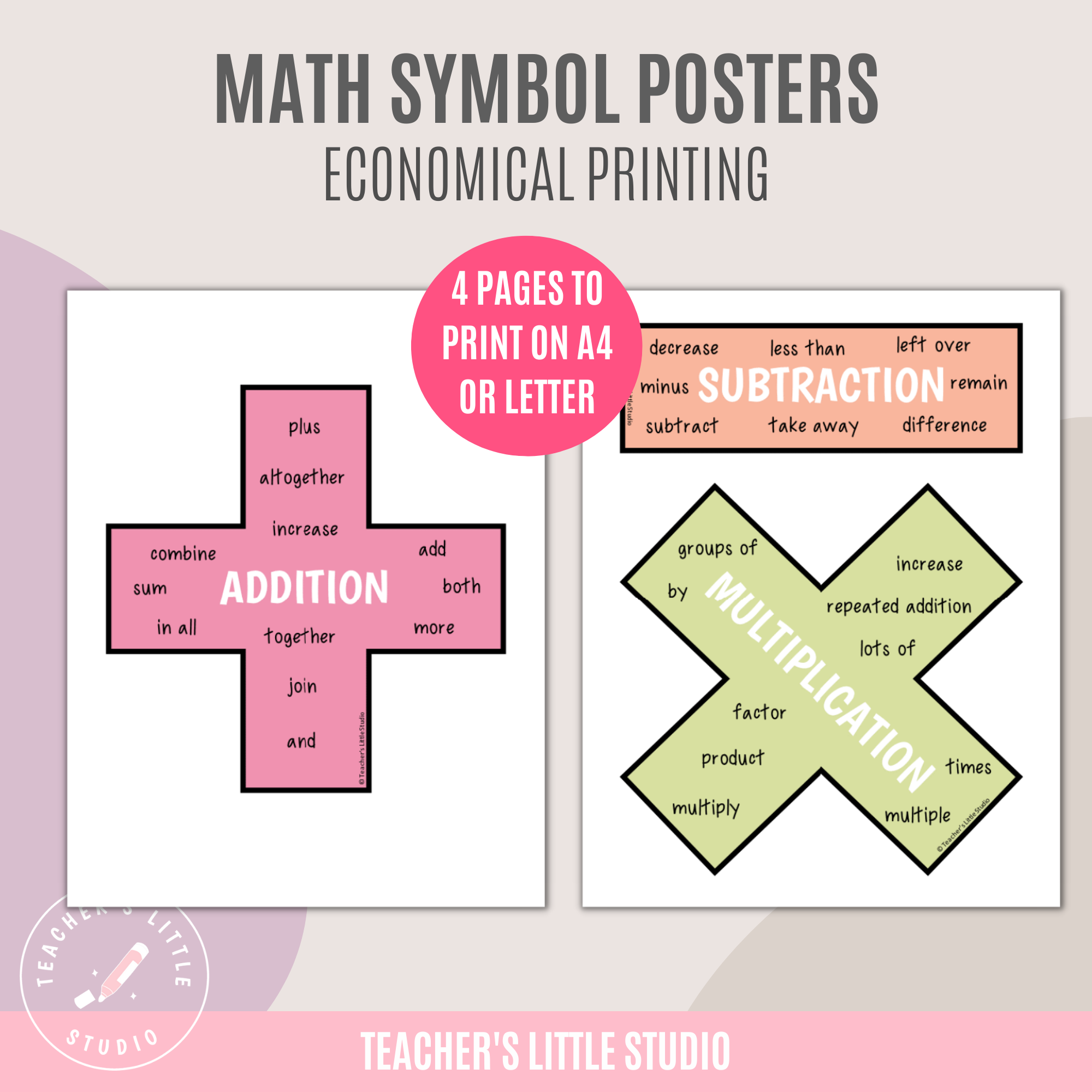 These posters are designed to print on A4 or Letter size paper. You can print one symbol per page for a bold display, or use the space-saving layout with five symbols across four pages. For an ink-friendly option, print on white or colored paper — perfect for reducing ink use while keeping your classroom vibrant.
