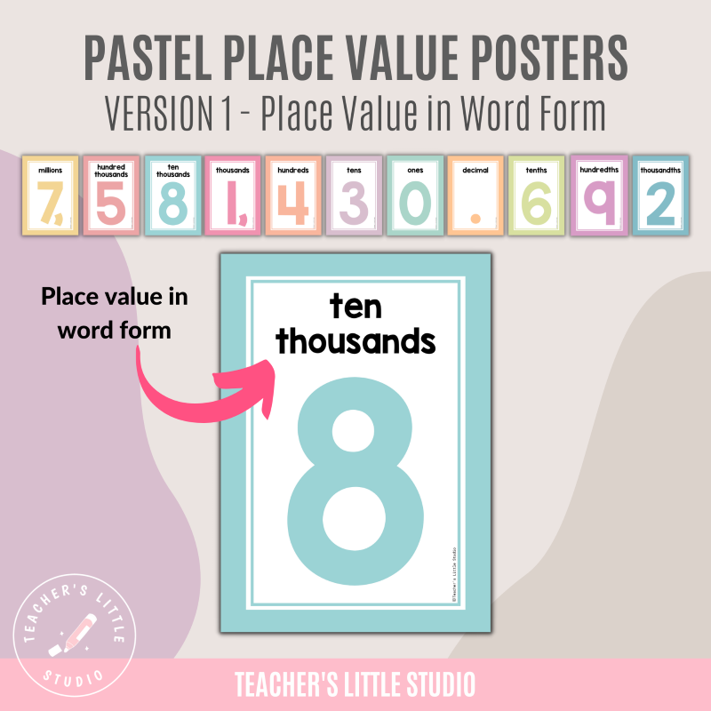 These Pastel Place Value Posters are perfect for helping elementary and primary students understand the number system. Includes 24 colorful and black-and-white posters in word and number form.