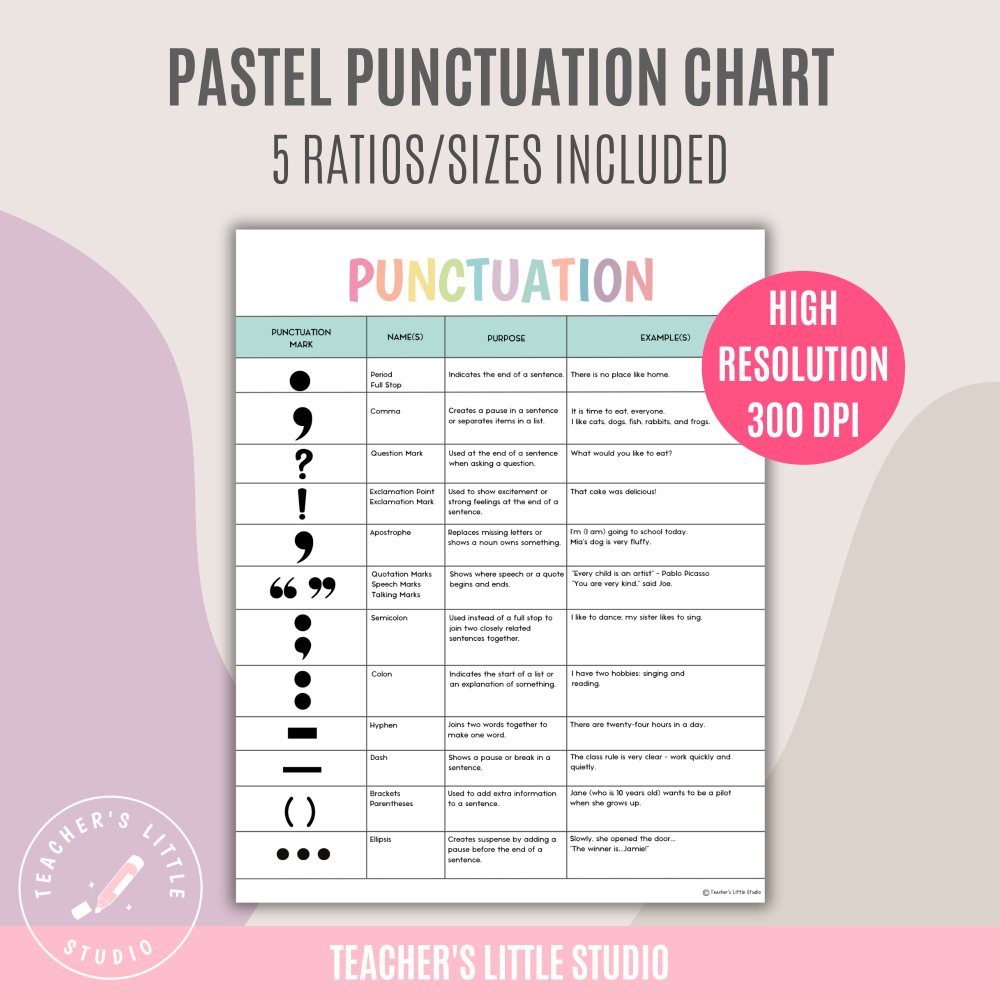 This Pastel Punctuation Chart is a one-page printable perfect for student workbooks or classroom display. Includes 12 punctuation marks with examples in high-resolution PDF and JPG files.