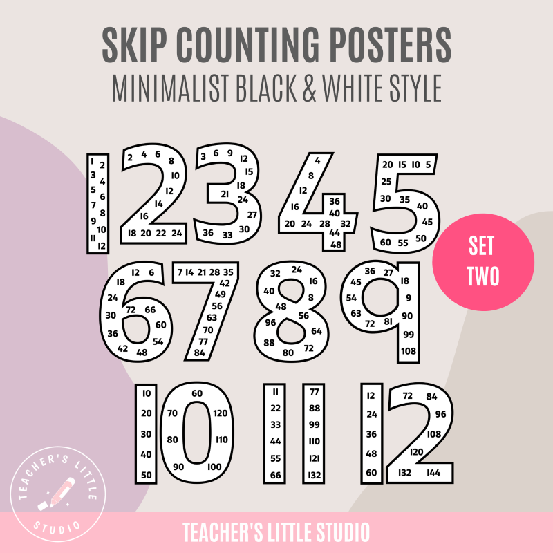 Make skip counting and multiplication practice easy with these Pastel Skip Counting Posters. Includes 3 sets (pastel, black and white, and plain) with numbers 1–12 for elementary, primary, and homeschool math walls.