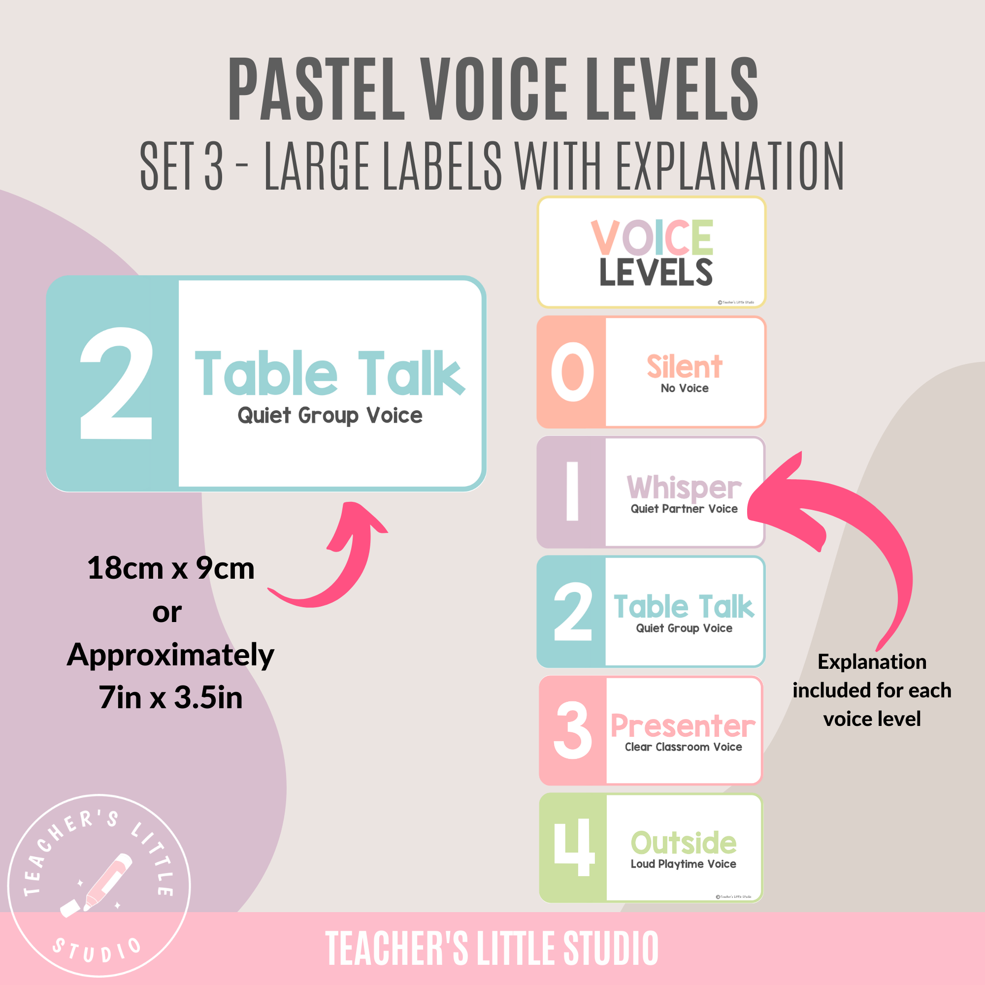 The printables come in a calming pastel palette, perfect for creating a warm and inviting classroom. You can choose to display noise levels as full-page posters or larger individual labels, with optional explanations for each voice level to support student understanding.